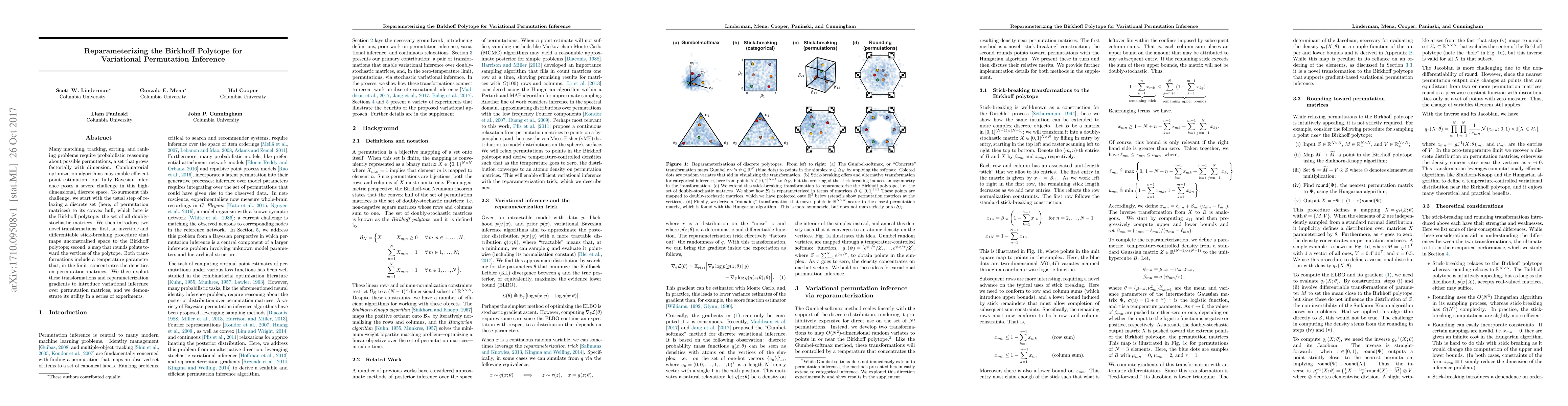 This paper proposes novel transformations to reparameterize the Birkhoff polytope for efficient variational inference over permutation matrices, addressing the challenge of high-dimensional discrete spaces in probabilistic reasoning. The transformations include a differentiable stick-breaking procedure and a rounding map, enabling effective variational inference and demonstrated utility in experiments.