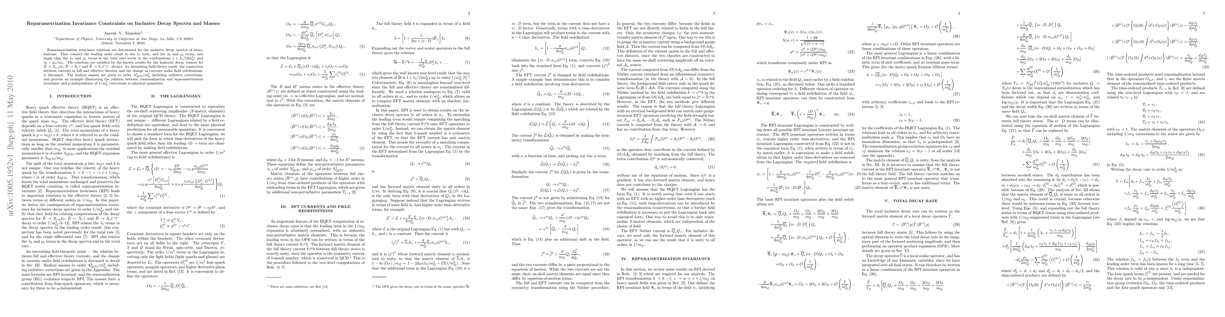 This paper establishes reparametrization invariance constraints for inclusive decay spectra of heavy hadrons, linking leading order results to specific terms and showing consistency with known decay tensors. It also explores the connection between currents in full and effective theories and provides hadron mass corrections to order (Λ_QCD)^3/m_Q^2, illustrating the interplay between renormalization and reparametrization invariance.