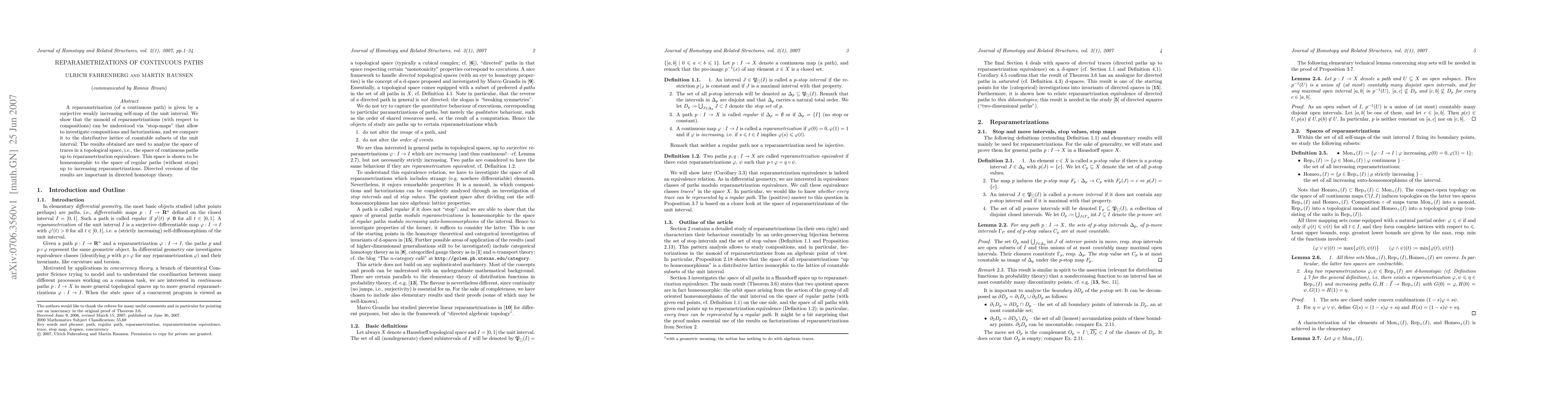 Researchers discovered that reparametrizations of continuous paths can be analyzed using stop-maps, which allows for the study of compositions and factorizations. This leads to a homeomorphic equivalence between the space of traces and the space of regular paths.