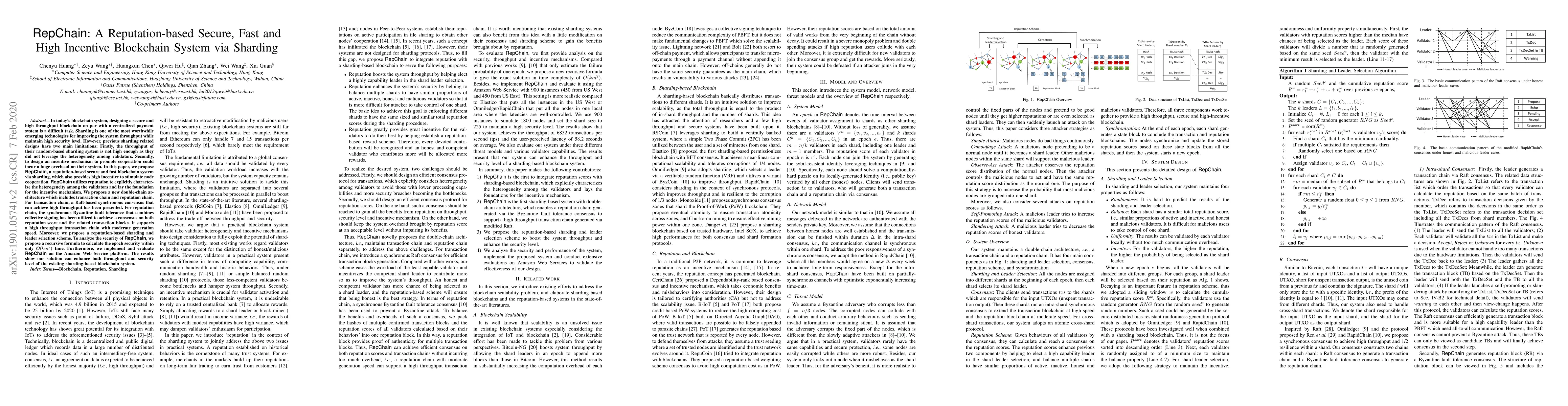 RepChain introduces a reputation-based, sharding-enabled blockchain system featuring high throughput and security through a double-chain architecture, combining Raft consensus for transactions and synchronous Byzantine fault tolerance for reputation, while optimizing for validator heterogeneity and cooperative incentives.