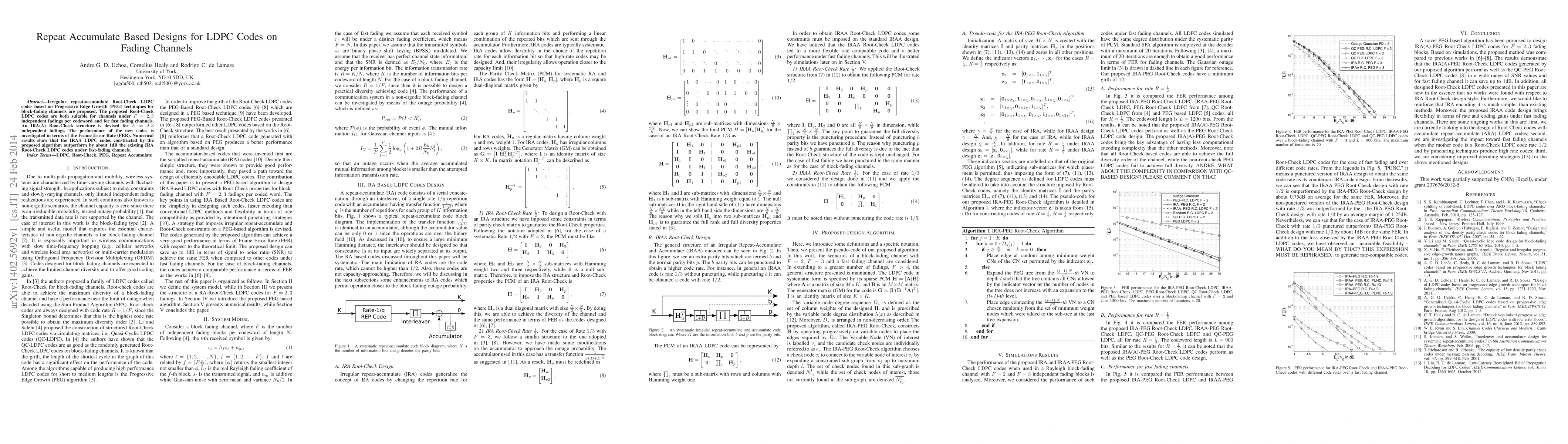 Irregular repeat-accumulate Root-Check LDPC codes based on Progressive Edge Growth (PEG) techniques for block-fading channels are proposed. The proposed Root-Check LDPC codes are {both suitable for channels under $F = 2, 3$ independent fadings per codeword and} for fast fading channels. An IRA(A) Root-Check structure is devised for $F = 2, 3$ independent fadings. The performance of the new codes is investigated in terms of the Frame Error Rate (FER). Numerical results show that the IRAA LDPC codes constructed by the proposed algorithm {outperform by about 1dB the existing} IRA Root-Check LDPC codes under fast-fading channels.