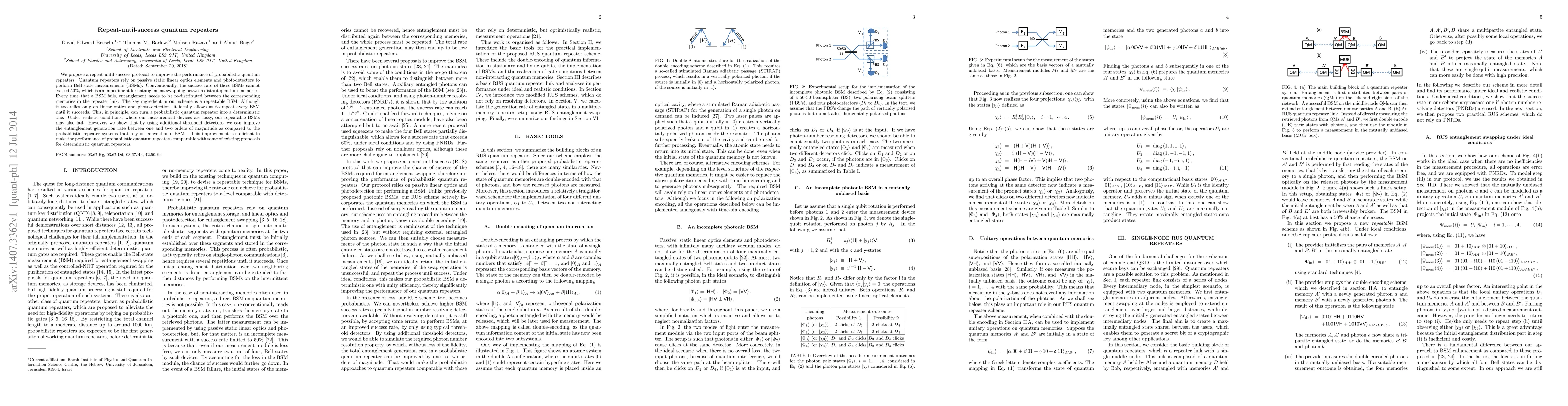 We propose a repeat-until-success protocol to improve the performance of probabilistic quantum repeaters. Quantum repeaters rely on passive static linear optics elements and photodetectors to perform Bell-state measurements (BSMs). Conventionally, the success rate of these BSMs cannot exceed 50%, which is an impediment for entanglement swapping between distant quantum memories. Every time that a BSM fails, entanglement needs to be re-distributed between the corresponding memories in the repeater link. The key ingredient in our scheme is a repeatable BSM. Although it too relies only on linear optics and photo-detection, it ideally allows us to repeat every BSM until it succeeds. This, in principle, can turn a probabilistic quantum repeater into a deterministic one. Under realistic conditions, where our measurement devices are lossy, our repeatable BSMs may also fail. However, we show that by using additional threshold detectors, we can improve the entanglement generation rate between one and two orders of magnitude as compared to the probabilistic repeater systems that rely on conventional BSMs. This improvement is sufficient to make the performance of probabilistic quantum repeaters comparable with some of existing proposals for deterministic quantum repeaters.