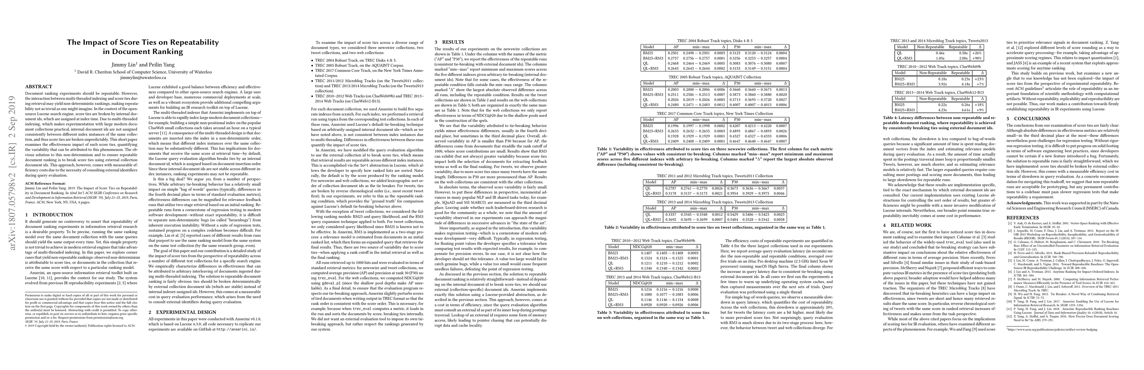 Researchers investigated how score ties in document ranking affect repeatability in Lucene search engine experiments, finding that non-deterministic rankings can lead to variability in results. They suggest breaking score ties using external collection IDs to ensure repeatable rankings, but this approach incurs efficiency costs.