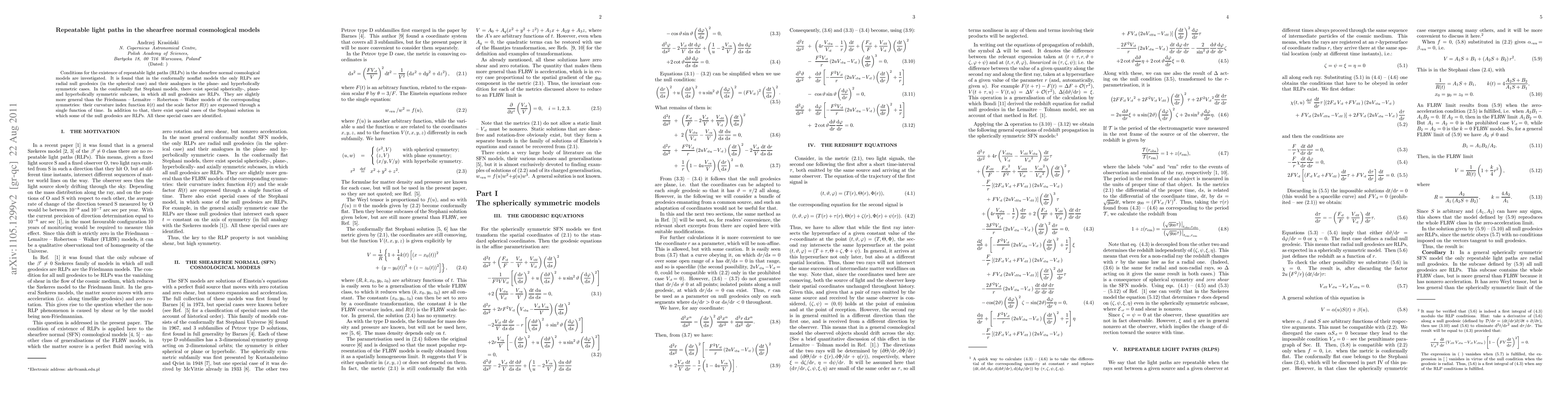 Conditions for the existence of repeatable light paths (RLPs) in the shearfree normal cosmological models are investigated. It is found that in the conformally nonflat models the only RLPs are radial null geodesics (in the spherical case) and their analogues in the plane- and hyperbolically symmetric cases. In the conformally flat Stephani models, there exist special spherically-, plane- and hyperbolically symmetric subcases, in which all null geodesics are RLPs. They are slightly more general than the Friedmann -- Lema\^{\i}tre -- Robertson -- Walker (FLRW) models of the corresponding symmetries: their curvature index function $k(t)$ and the scale factor $R(t)$ are expressed through a single function of time. In addition to that, there exist special cases of the Stephani solution in which some of the null geodesics are RLPs. All these special cases are identified.