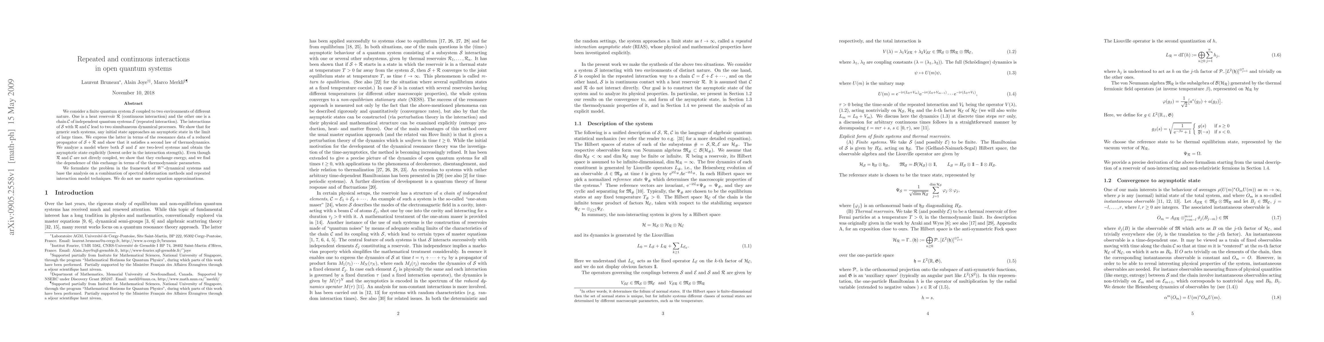 We consider a finite quantum system S coupled to two environments of different nature. One is a heat reservoir R (continuous interaction) and the other one is a chain C of independent quantum systems E (repeated interaction). The interactions of S with R and C lead to two simultaneous dynamical processes. We show that for generic such systems, any initial state approaches an asymptotic state in the limit of large times. We express the latter in terms of the resonance data of a reduced propagator of S+R and show that it satisfies a second law of thermodynamics. We analyze a model where both S and E are two-level systems and obtain the asymptotic state explicitly (lowest order in the interaction strength). Even though R and C are not direcly coupled, we show that they exchange energy, and we find the dependence of this exchange in terms of the thermodynamic parameters. We formulate the problem in the framework of W*-dynamical systems and base the analysis on a combination of spectral deformation methods and repeated interaction model techniques. We do not use master equation approximations.