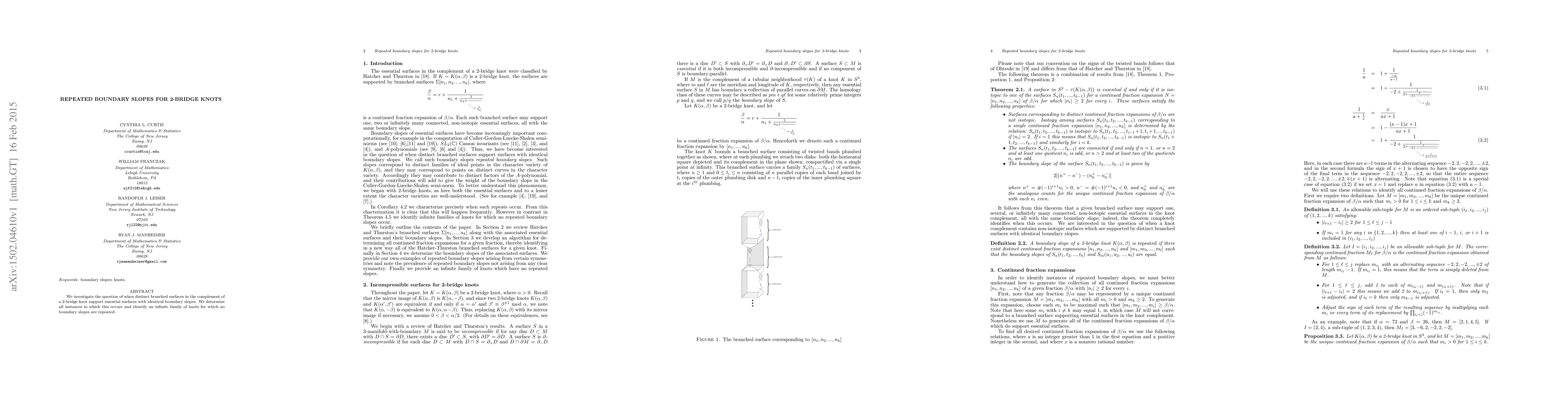 Summary: This research identifies cases where distinct branched surfaces in the complement of 2-bridge knots support essential surfaces with identical boundary slopes, concluding that no boundary slopes are repeated for an infinite family of such knots.