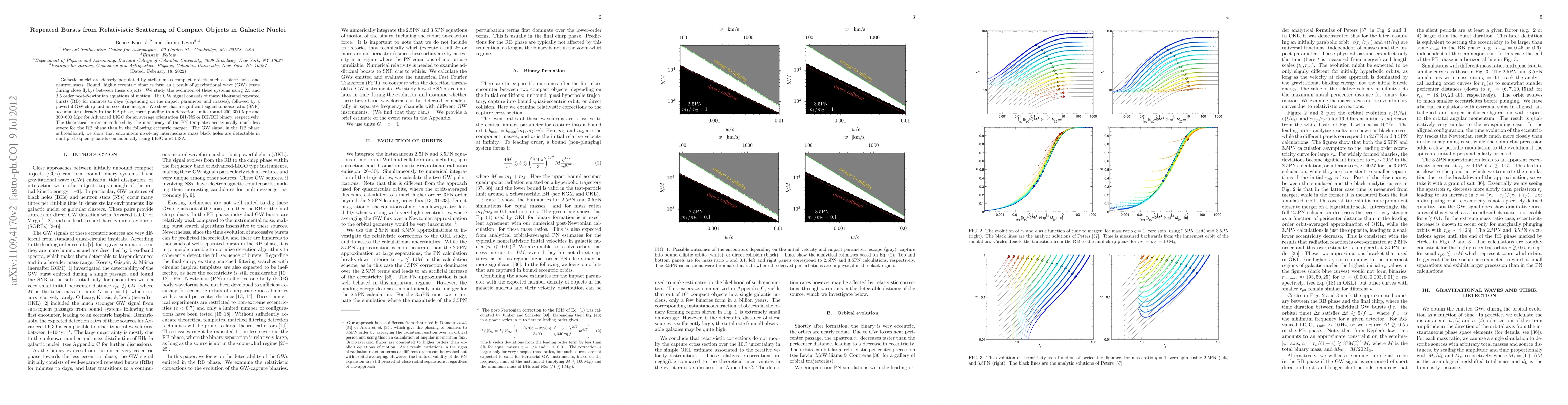 Galactic nuclei are densely populated by stellar mass compact objects such as black holes and neutron stars. Bound, highly eccentric binaries form as a result of gravitational wave (GW) losses during close flybys between these objects. We study the evolution of these systems using 2.5 and 3.5 order post-Newtonian equations of motion. The GW signal consists of many thousand repeated bursts (RB) for minutes to days (depending on the impact parameter and masses), followed by a powerful GW chirp and an eccentric merger. We show that a significant signal to noise ratio (SNR) accumulates already in the RB phase, corresponding to a detection limit around 200-300 Mpc and 300--600 Mpc for Advanced LIGO for an average orientation BH/NS or BH/BH binary, respectively. The theoretical errors introduced by the inaccuracy of the PN templates are typically much less severe for the RB phase than in the following eccentric merger. The GW signal in the RB phase is broadband; we show that encounters involving intermediate mass black holes are detectable in multiple frequency bands coincidentally using LIGO and LISA.