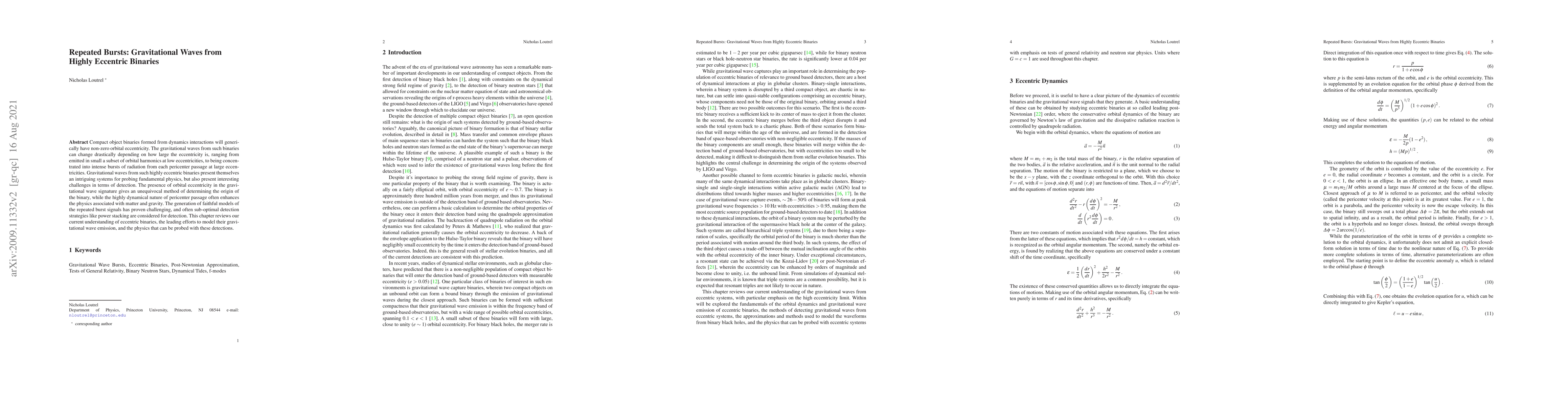 Compact object binaries formed from dynamics interactions will generically have non-zero orbital eccentricity. The gravitational waves from such binaries can change drastically depending on how large the eccentricity is, ranging from emitted in small a subset of orbital harmonics at low eccentricities, to being concentrated into intense bursts of radiation from each pericenter passage at large eccentricities. Gravitational waves from such highly eccentric binaries present themselves an intriguing systems for probing fundamental physics, but also present interesting challenges in terms of detection. The presence of orbital eccentricity in the gravitational wave signature gives an unequivocal method of determining the origin of the binary, while the highly dynamical nature of pericenter passage often enhances the physics associated with matter and gravity. The generation of faithful models of the repeated burst signals has proven challenging, and often sub-optimal detection strategies like power stacking are considered for detection. This chapter reviews our current understanding of eccentric binaries, the leading efforts to model their gravitational wave emission, and the physics that can be probed with these detections.