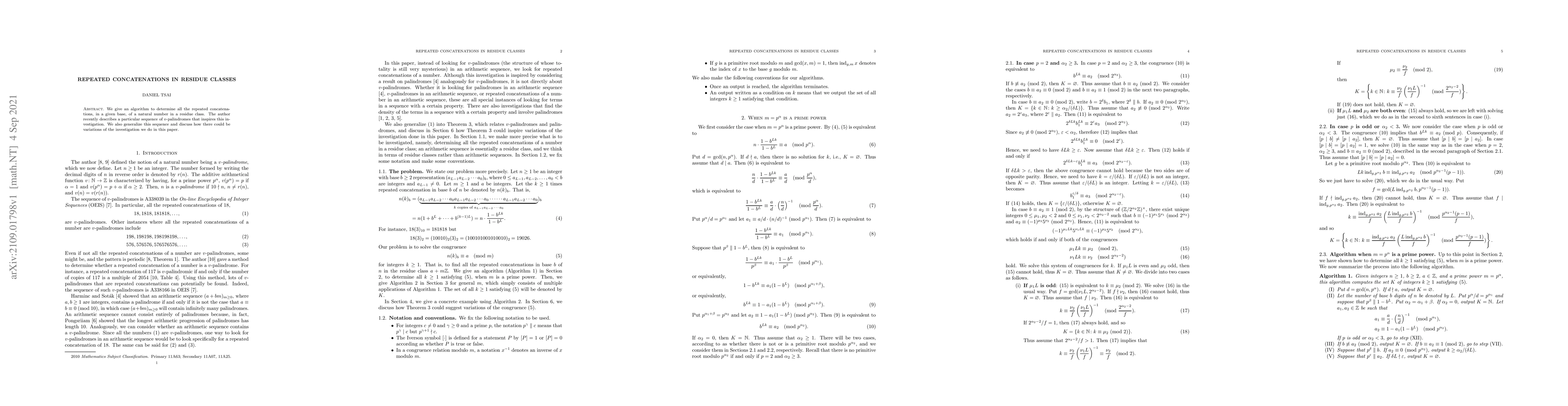 Summary: This paper presents an algorithm to identify all repeated concatenations of a natural number within a specified residue class, inspired by a sequence of $v$-palindromes. It also explores generalizations of this sequence and potential future research directions.