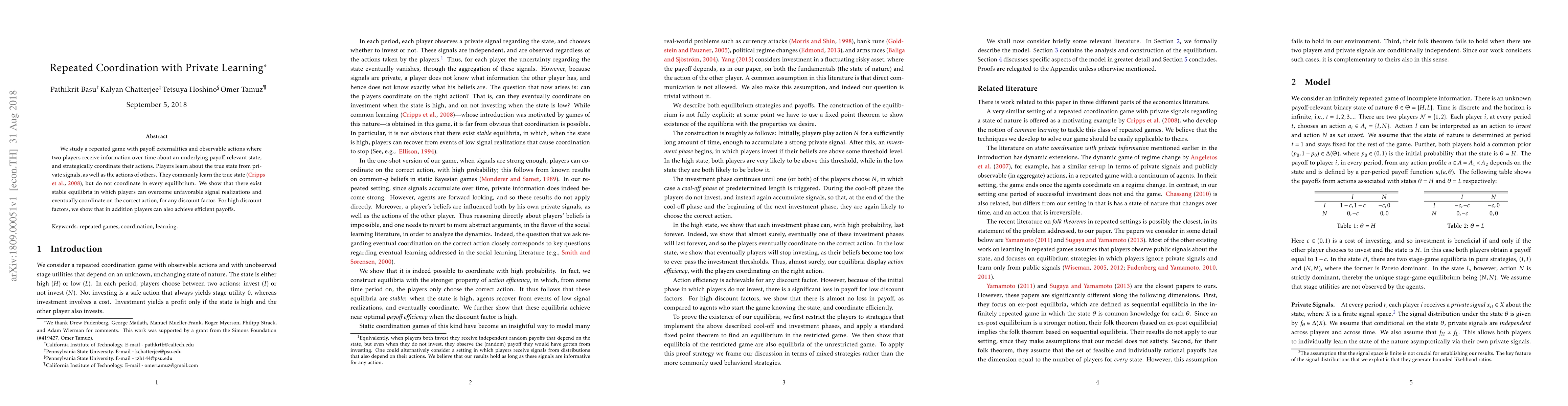 This paper examines a repeated game with observable actions and payoff externalities where players learn about a state through private signals and others' actions. It demonstrates stable equilibria allowing players to coordinate correctly despite unfavorable signals, and under high discount factors, efficient payoffs can also be achieved.