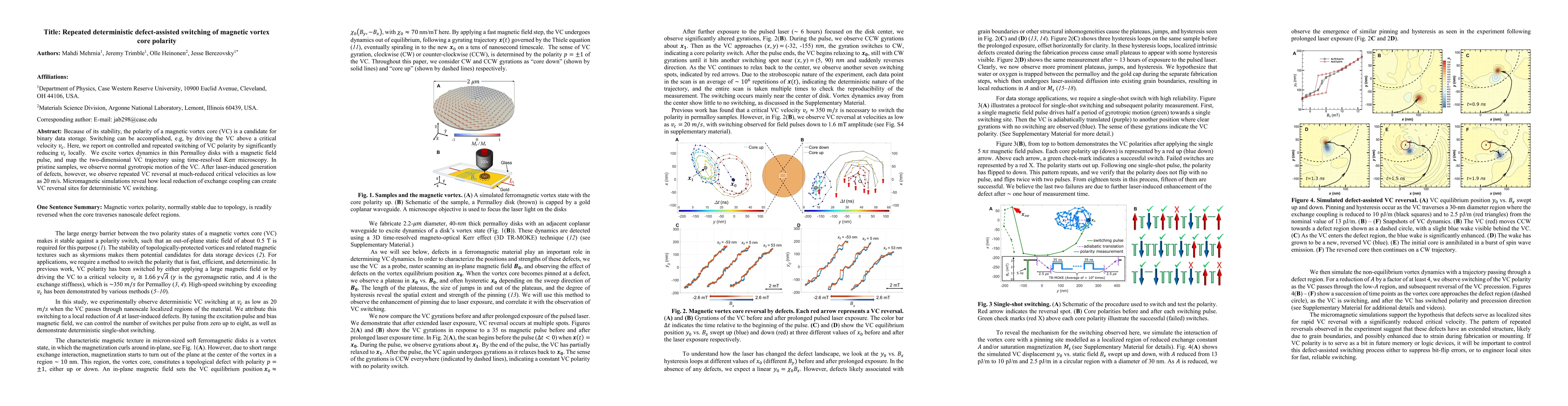 This paper reports on the controlled and repeated switching of magnetic vortex core polarity in thin Permalloy disks by generating defects with a laser, significantly reducing the critical velocity needed for switching. Micromagnetic simulations explain how local reduction of exchange coupling creates sites for deterministic vortex core reversal.