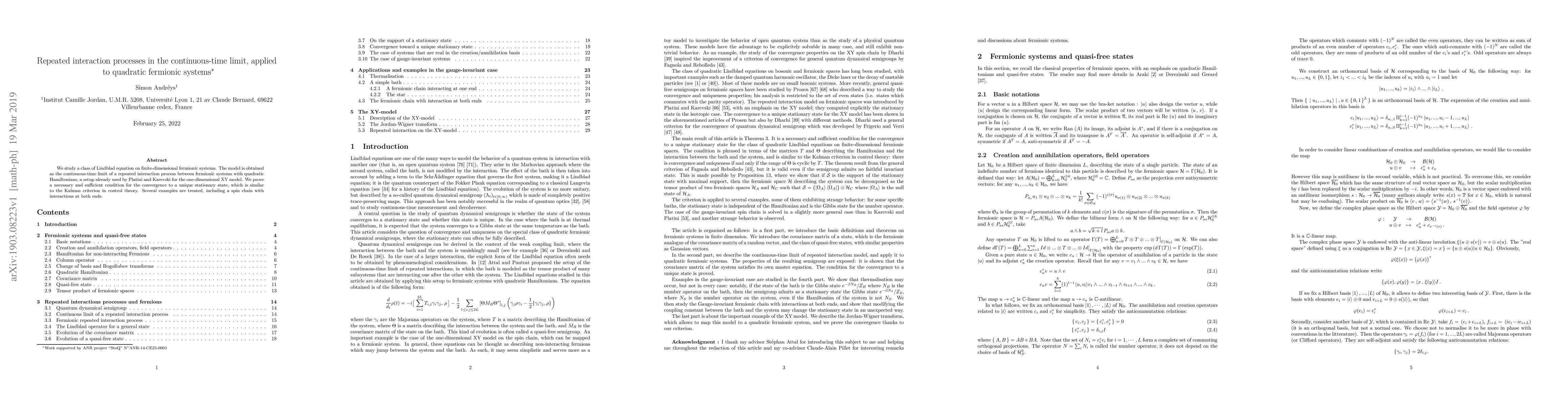 We study a class of Lindblad equation on finite-dimensional fermionic systems. The model is obtained as the continuous-time limit of a repeated interaction process between fermionic systems with quadratic Hamiltonians, a setup already used by Platini and Karevski for the one-dimensional XY model. We prove a necessary and sufficient condition for the convergence to a unique stationary state, which is similar to the Kalman criterion in control theory. Several examples are treated, including a spin chain with interactions at both ends.