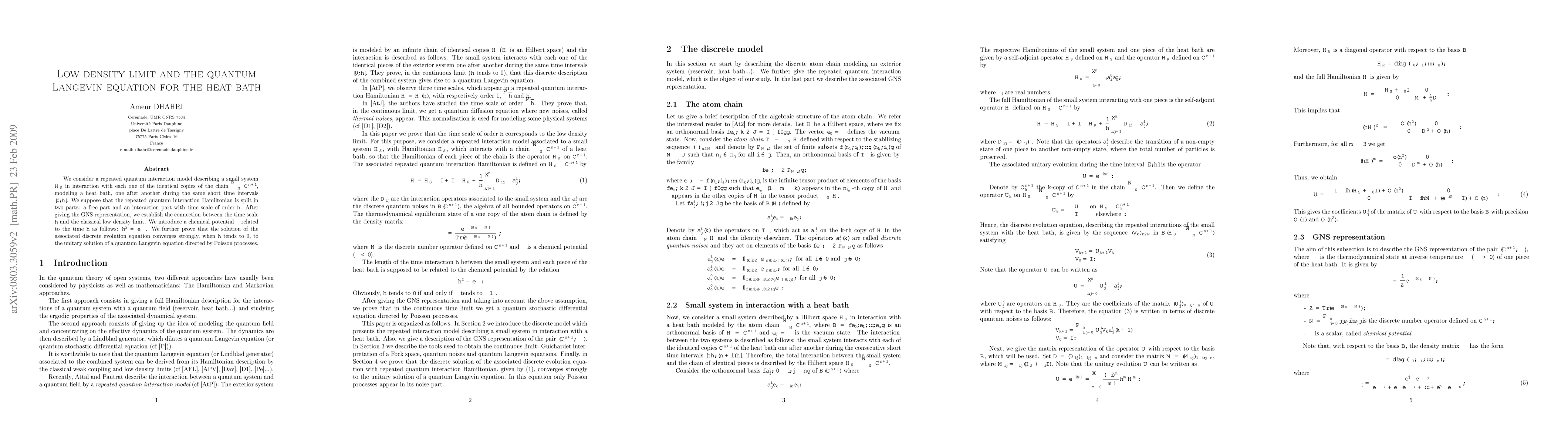 This paper investigates a repeated quantum interaction model where a small quantum system $\Hh_S$ interacts sequentially with identical heat baths during short time intervals. The study establishes a connection between the interaction time scale $h$ and the classical low density limit, proving strong convergence of the discrete evolution equation to a quantum Langevin equation driven by Poisson processes as $h$ approaches 0.