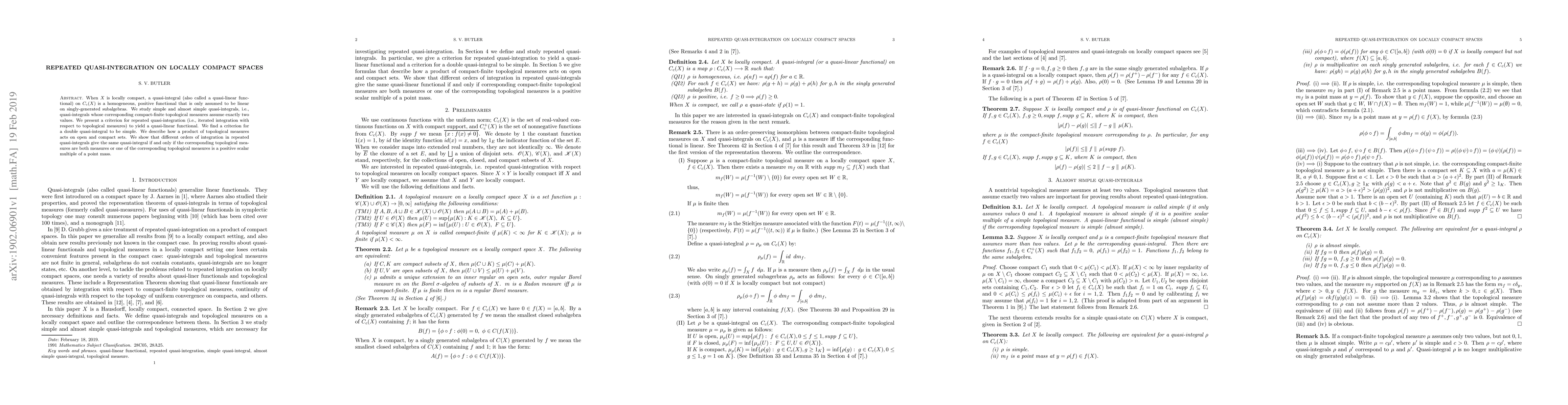 This paper explores quasi-integrals on locally compact spaces, focusing on simple and almost simple quasi-integrals that correspond to compact-finite topological measures assuming exactly two values. It provides criteria for repeated quasi-integration to yield quasi-linear functionals and for double quasi-integrals to be simple, while also detailing how products of topological measures operate on sets and conditions under which different integration orders yield the same quasi-integral.