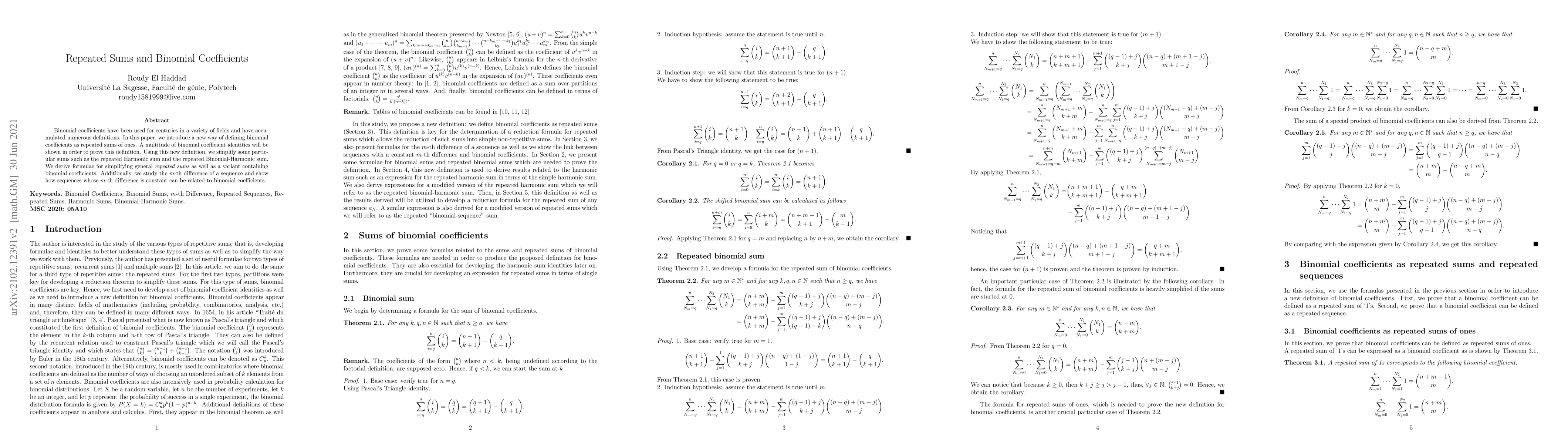 This paper redefines binomial coefficients as repeated sums of ones, demonstrating numerous identities to support this new definition. It simplifies specific sums like the repeated Harmonic sum and introduces general formulae for simplifying repeated sums involving binomial coefficients, also exploring the $m$-th difference of sequences related to these coefficients.