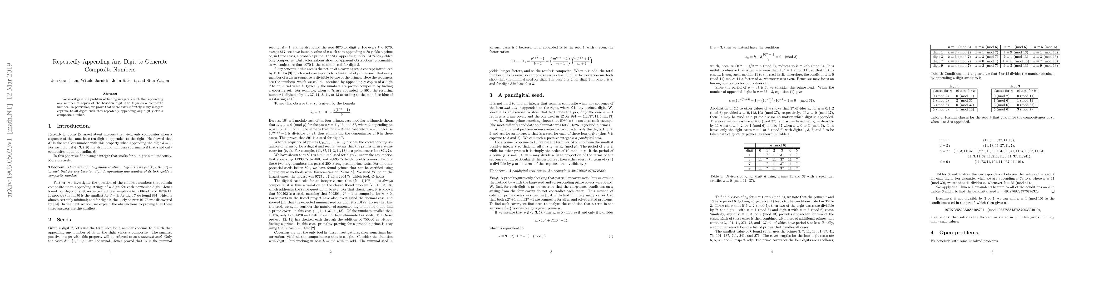 We investigate the problem of finding integers $k$ such that appending any number of copies of the base-ten digit $d$ to $k$ yields a composite number. In particular, we prove that there exist infinitely many integers coprime to all digits such that repeatedly appending {\it any} digit yields a composite number.