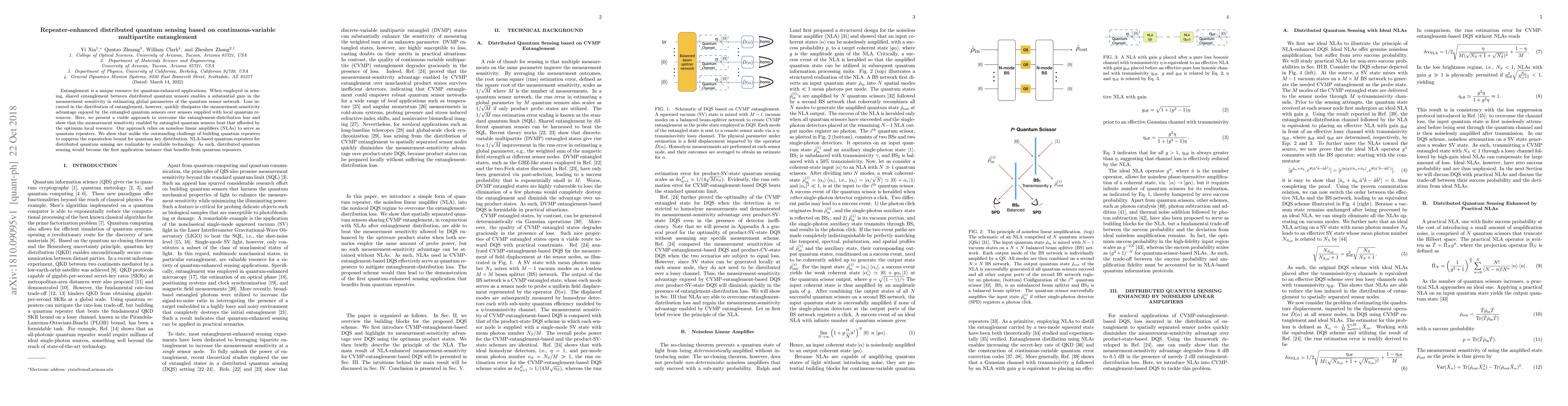 This paper proposes a method to enhance distributed quantum sensing using continuous-variable multipartite entanglement and noiseless linear amplifiers (NLAs) as quantum repeaters to overcome the loss of entanglement during distribution, thereby surpassing the sensitivity of local quantum sensors. The approach demonstrates that distributed quantum sensing can be the first application to benefit from practical quantum repeaters.