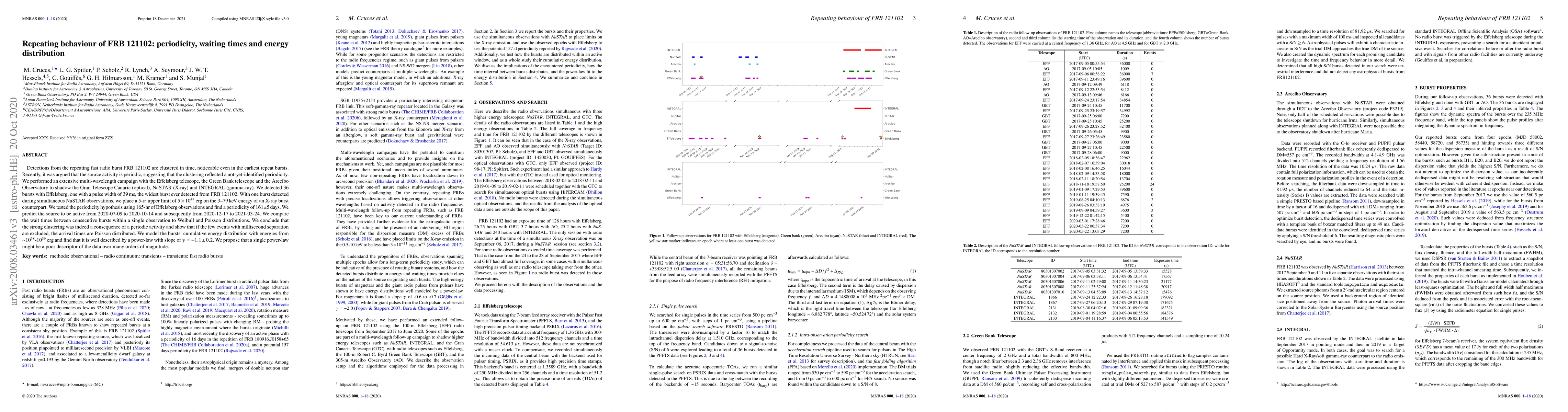 Detections from the repeating fast radio burst FRB 121102 are clustered in time, noticeable even in the earliest repeat bursts. Recently, it was argued that the source activity is periodic, suggesting that the clustering reflected a not-yet-identified periodicity. We performed an extensive multi-wavelength campaign with the Effelsberg telescope, the Green Bank telescope and the Arecibo Observatory to shadow the Gran Telescope Canaria (optical), NuSTAR (X-ray) and INTEGRAL (gamma-ray). We detected 36 bursts with Effelsberg, one with a pulse width of 39\,ms, the widest burst ever detected from FRB 121102. With one burst detected during simultaneous NuSTAR observations, we place a 5-$\sigma$ upper limit of $5\times10^{47}$ erg on the 3--79\,keV energy of an X-ray burst counterpart. We tested the periodicity hypothesis using 165-hr of Effelsberg observations and find a periodicity of 161$\pm$5 days. We predict the source to be active from 2020-07-09 to 2020-10-14 and subsequently from 2020-12-17 to 2021-03-24. We compare the wait times between consecutive bursts within a single observation to Weibull and Poisson distributions. We conclude that the strong clustering was indeed a consequence of a periodic activity and show that if the few events with millisecond separation are excluded, the arrival times are Poisson distributed. We model the bursts' cumulative energy distribution with energies from ${\sim}10^{38}$-$10^{39}$ erg and find that it is well described by a power-law with slope of $\gamma=-1.1\pm 0.2$. We propose that a single power-law might be a poor descriptor of the data over many orders of magnitude.