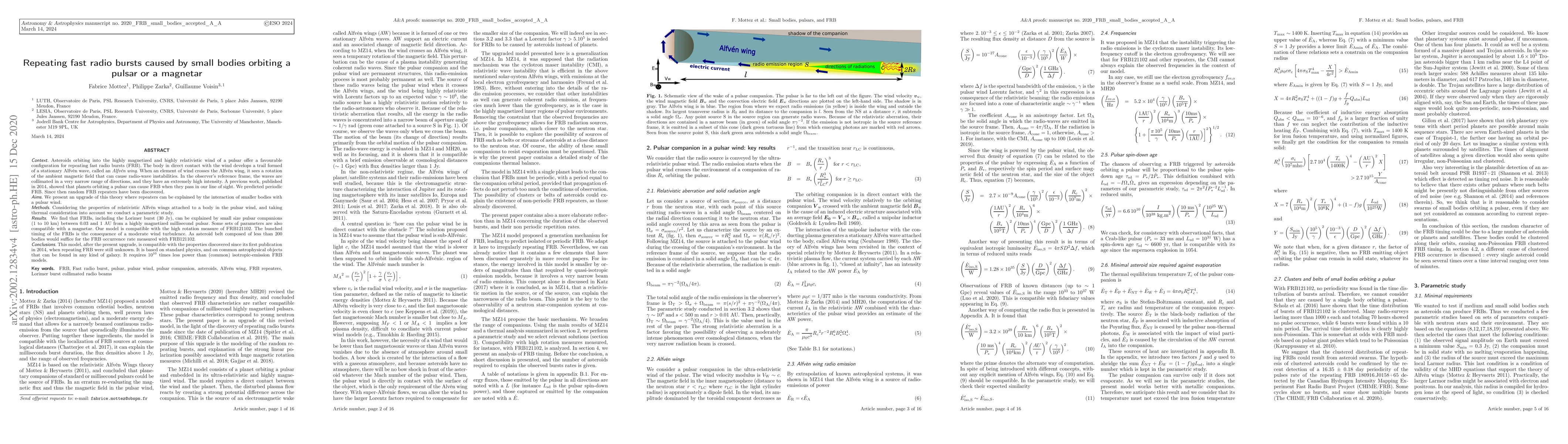 Asteroids orbiting into the highly magnetized and highly relativistic wind of a pulsar offer a favourable configuration for repeating fast radio bursts (FRB). The body in direct contact with the wind develops a trail formed of a stationary Alfv\'en wave, called an \textit{Alfv\'en wing}. When an element of wind crosses the Alfv\'en wing, it sees a rotation of the ambient magnetic field that can cause radio-wave instabilities. In the observer's reference frame, the waves are collimated in a very narrow range of directions, and they have an extremely high intensity. A previous work, published in 2014, showed that planets orbiting a pulsar can cause FRB when they pass in our line of sight. We predicted periodic FRB. Since then random FRB repeaters have been discovered. We present an upgrade of this theory where repeaters can be explained by the interaction of smaller bodies with a pulsar wind. Considering the properties of relativistic Alfv\'en wings attached to a body in the pulsar wind, and taking thermal consideration into account we conduct a parametric study. We find that FRBs, including the Lorimer burst (30 Jy), can be explained by small size pulsar companions (1 to 10 km) between 0.03 and 1 AU from a highly magnetized millisecond pulsar. Some sets of parameters are also compatible with a magnetar. Our model is compatible with the high rotation measure of FRB121102. The bunched timing of the FRBs is the consequence of a moderate wind turbulence. As asteroid belt composed of less than 200 bodies would suffice for the FRB occurrence rate measured with FRB121102. This model, after the present upgrade, is compatible with the properties discovered since its first publication in 2014, when repeating FRB were still unknown. It is based on standard physics, and on common astrophysical objects that can be found in any kind of galaxy. It requires $10^{10}$ times less power than (common) isotropic-emission FRB models.