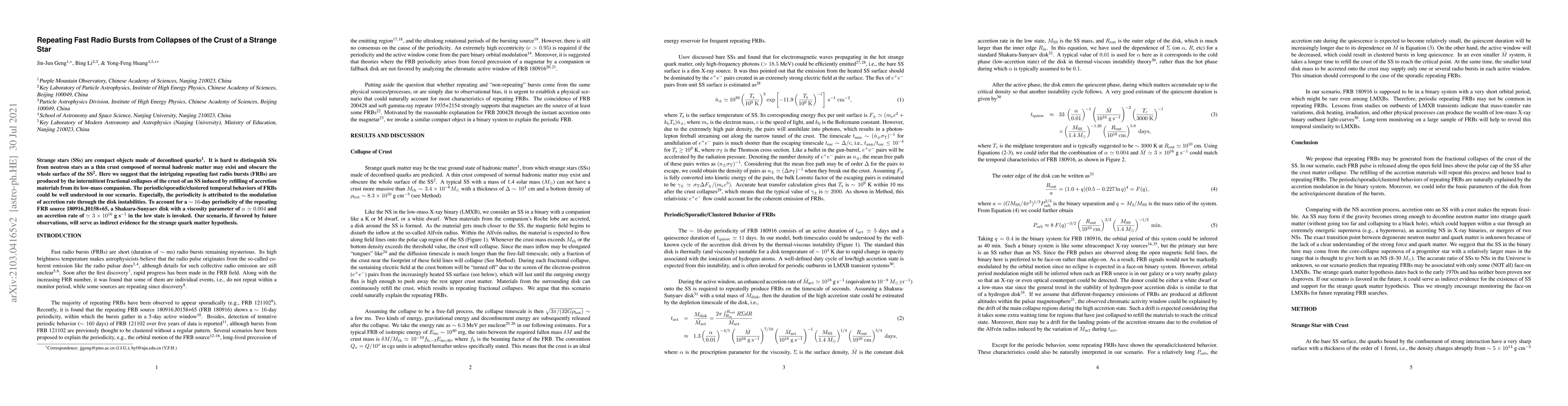 Strange stars (SSs) are compact objects made of deconfined quarks. It is hard to distinguish SSs from neutron stars as a thin crust composed of normal hadronic matter may exist and obscure the whole surface of the SS. Here we suggest that the intriguing repeating fast radio bursts (FRBs) are produced by the intermittent fractional collapses of the crust of an SS induced by refilling of accretion materials from its low-mass companion. The periodic/sporadic/clustered temporal behaviors of FRBs could be well understood in our scenario. Especially, the periodicity is attributed to the modulation of accretion rate through the disk instabilities. To account for a $\sim 16$-day periodicity of the repeating FRB source 180916.J0158+65, a Shakura-Sunyaev disk with a viscosity parameter of $\alpha \simeq 0.004$ and an accretion rate of $\simeq 3 \times 10^{16}$~g~s$^{-1}$ in the low state is invoked. Our scenario, if favored by future observations, will serve as indirect evidence for the strange quark matter hypothesis.