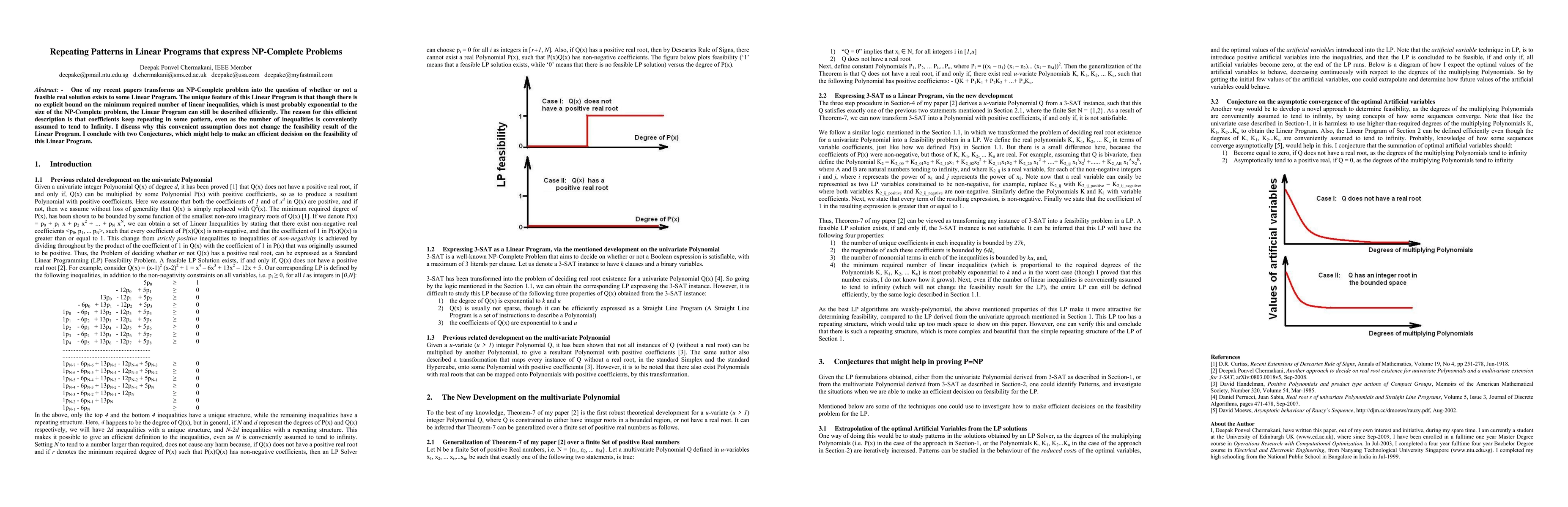 One of my recent papers transforms an NP-Complete problem into the question of whether or not a feasible real solution exists to some Linear Program. The unique feature of this Linear Program is that though there is no explicit bound on the minimum required number of linear inequalities, which is most probably exponential to the size of the NP-Complete problem, the Linear Program can still be described efficiently. The reason for this efficient description is that coefficients keep repeating in some pattern, even as the number of inequalities is conveniently assumed to tend to Infinity. I discuss why this convenient assumption does not change the feasibility result of the Linear Program. I conclude with two Conjectures, which might help to make an efficient decision on the feasibility of this Linear Program.