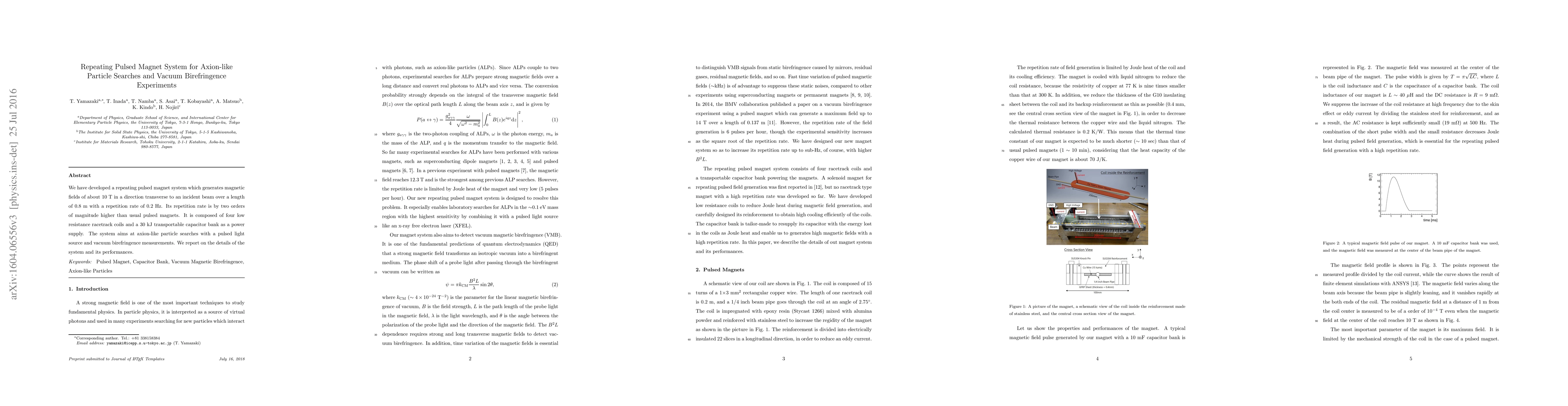 The paper describes a high-repetition rate pulsed magnet system generating 10 T transverse magnetic fields for axion-like particle searches and vacuum birefringence experiments, featuring four low-resistance coils and a 30 kJ capacitor bank. The system's 0.2 Hz rate is two orders of magnitude higher than conventional pulsed magnets.
