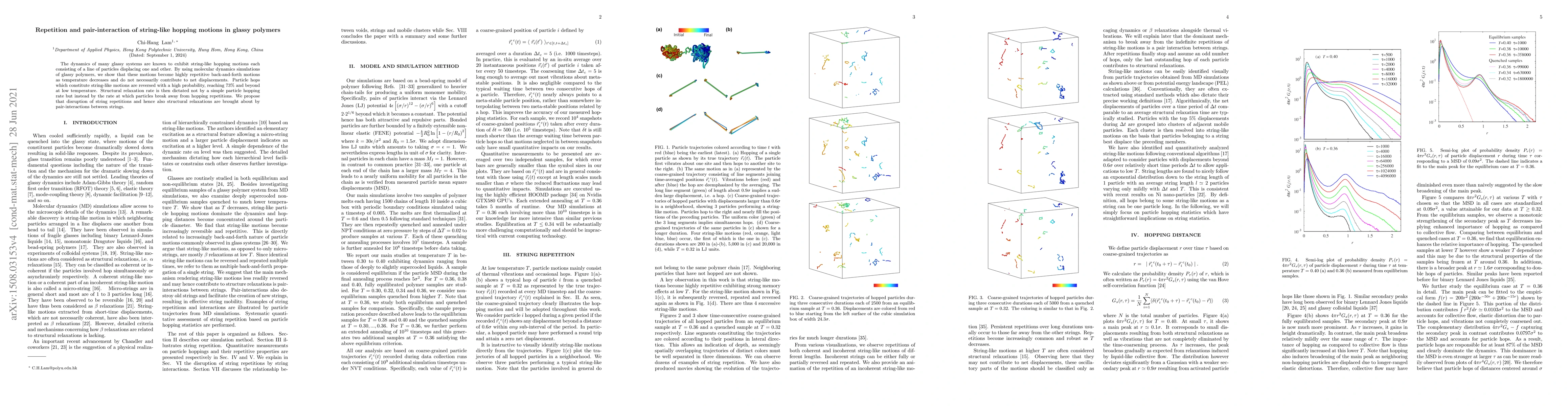 This paper uses molecular dynamics simulations to demonstrate that in glassy polymers, string-like hopping motions become highly repetitive and reversed at low temperatures, contributing minimally to net displacements. The structural relaxation rate is influenced by the rate at which particles break from these repetitive motions, which is facilitated by pair-interactions between the strings.