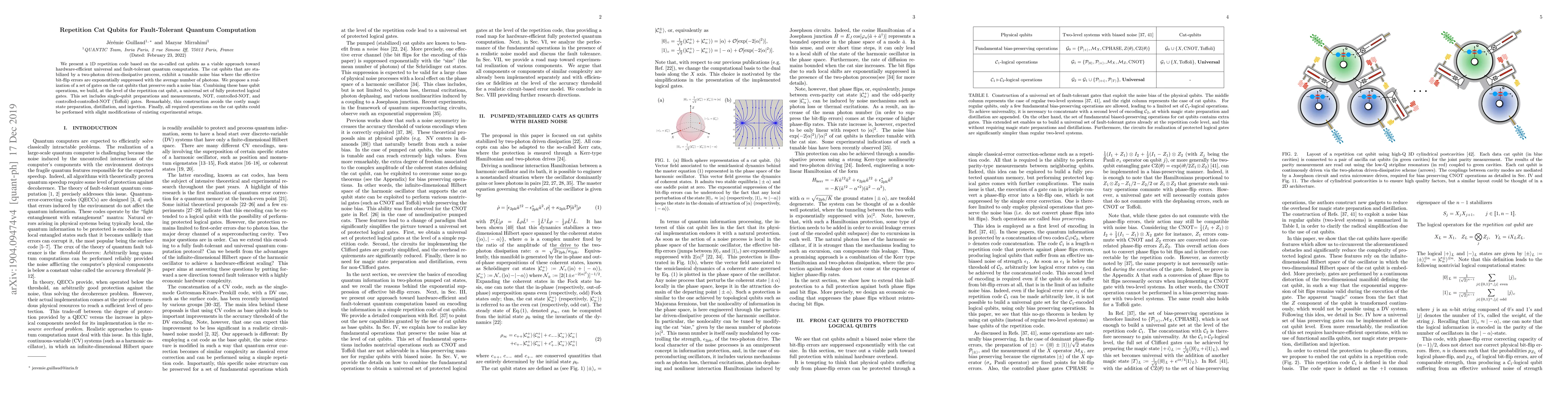 This paper proposes a 1D repetition code using cat qubits for efficient, fault-tolerant quantum computation, leveraging a tunable noise bias to suppress bit-flip errors. The approach avoids costly magic state preparation and uses existing experimental setups for gate operations.