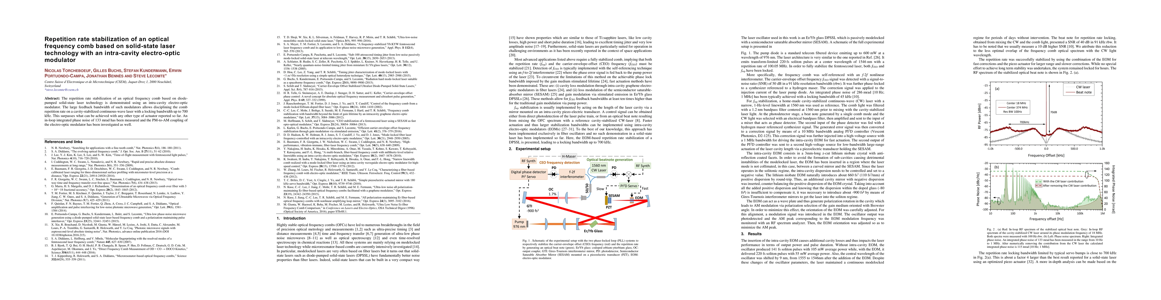 This paper demonstrates the stabilization of an optical frequency comb's repetition rate using solid-state laser technology and an intra-cavity electro-optic modulator, achieving a locking bandwidth up to 700 kHz. The study also measures an in-loop integrated phase noise of 133 mrad and investigates the PM-to-AM coupling of the modulator.