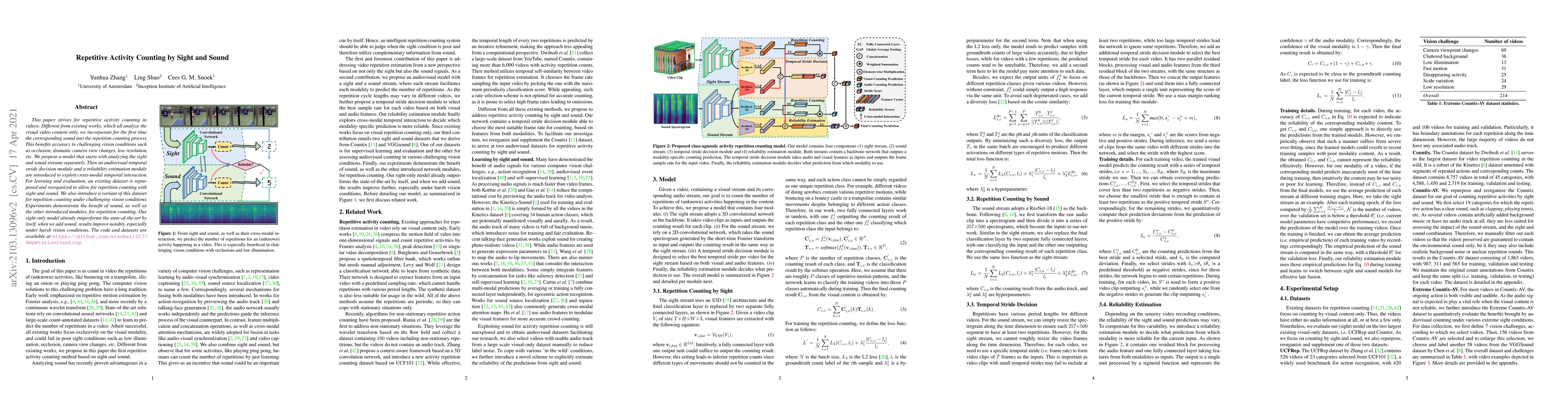 This paper strives for repetitive activity counting in videos. Different from existing works, which all analyze the visual video content only, we incorporate for the first time the corresponding sound into the repetition counting process. This benefits accuracy in challenging vision conditions such as occlusion, dramatic camera view changes, low resolution, etc. We propose a model that starts with analyzing the sight and sound streams separately. Then an audiovisual temporal stride decision module and a reliability estimation module are introduced to exploit cross-modal temporal interaction. For learning and evaluation, an existing dataset is repurposed and reorganized to allow for repetition counting with sight and sound. We also introduce a variant of this dataset for repetition counting under challenging vision conditions. Experiments demonstrate the benefit of sound, as well as the other introduced modules, for repetition counting. Our sight-only model already outperforms the state-of-the-art by itself, when we add sound, results improve notably, especially under harsh vision conditions.