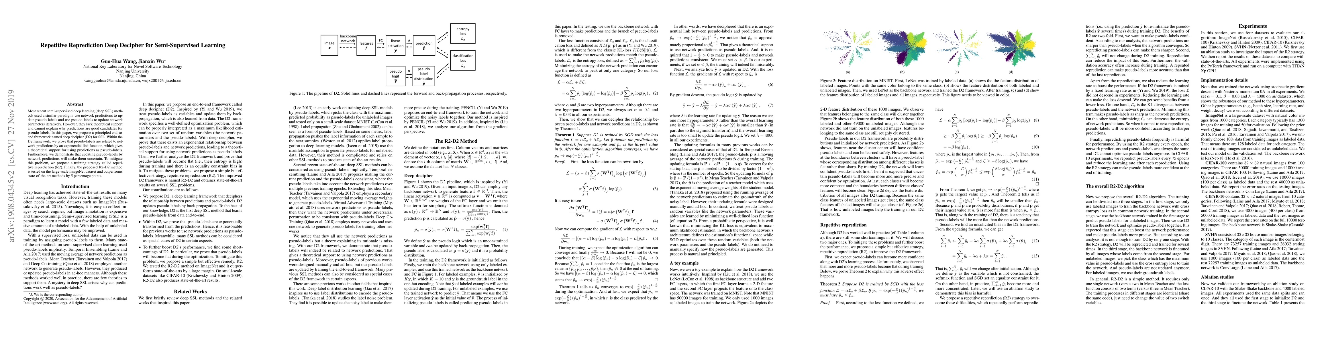 Most recent semi-supervised deep learning (deep SSL) methods used a similar paradigm: use network predictions to update pseudo-labels and use pseudo-labels to update network parameters iteratively. However, they lack theoretical support and cannot explain why predictions are good candidates for pseudo-labels. In this paper, we propose a principled end-to-end framework named deep decipher (D2) for SSL. Within the D2 framework, we prove that pseudo-labels are related to network predictions by an exponential link function, which gives a theoretical support for using predictions as pseudo-labels. Furthermore, we demonstrate that updating pseudo-labels by network predictions will make them uncertain. To mitigate this problem, we propose a training strategy called repetitive reprediction (R2). Finally, the proposed R2-D2 method is tested on the large-scale ImageNet dataset and outperforms state-of-the-art methods by 5 percentage points.