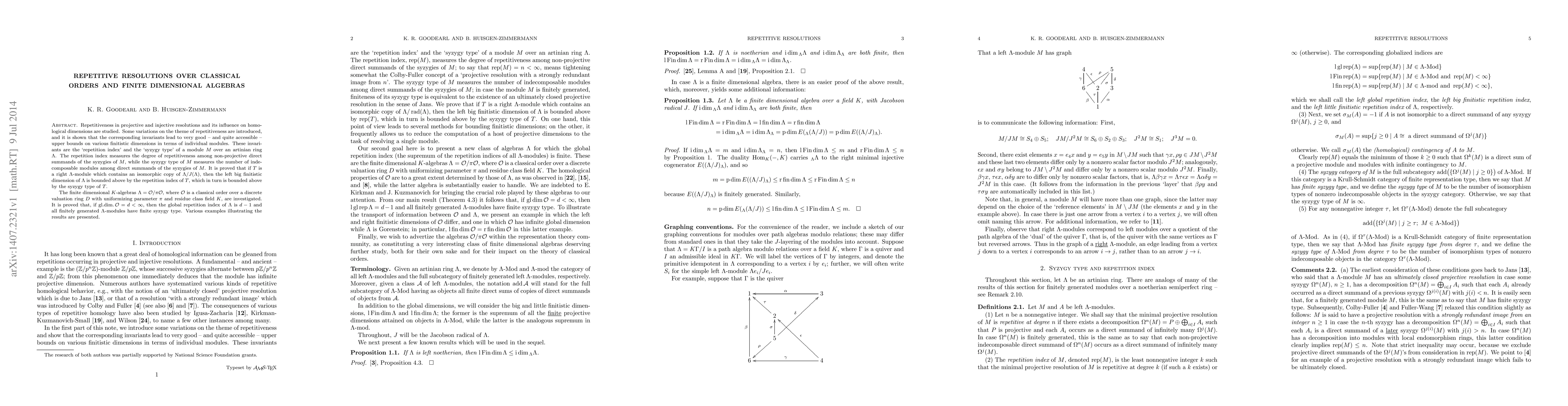 Repetitiveness in projective and injective resolutions and its influence on homological dimensions are studied. Some variations on the theme of repetitiveness are introduced, and it is shown that the corresponding invariants lead to very good -- and quite accessible -- upper bounds on various finitistic dimensions in terms of individual modules. These invariants are the `repetition index' and the `syzygy type' of a module $M$ over an artinian ring $\Lambda$. The repetition index measures the degree of repetitiveness among non-projective direct summands of the syzygies of $M$, while the syzygy type of $M$ measures the number of indecomposable modules among direct summands of the syzygies of $M$. It is proved that if $T$ is a right $\Lambda$-module which contains an isomorphic copy of $\Lambda/J(\Lambda)$, then the left big finitistic dimension of $\Lambda$ is bounded above by the repetition index of $T$, which in turn is bounded above by the syzygy type of $T$. The finite dimensional $K$-algebras $\Lambda = {\cal O}/\pi{\cal O}$, where $\cal O$ is a classical order over a discrete valuation ring $D$ with uniformizing parameter $\pi$ and residue class field $K$, are investigated. It is proved that, if $\text{gl.dim.}\, {\cal O} =d<\infty$, then the global repetition index of $\Lambda$ is $d-1$ and all finitely generated $\Lambda$-modules have finite syzygy type. Various examples illustrating the results are presented.