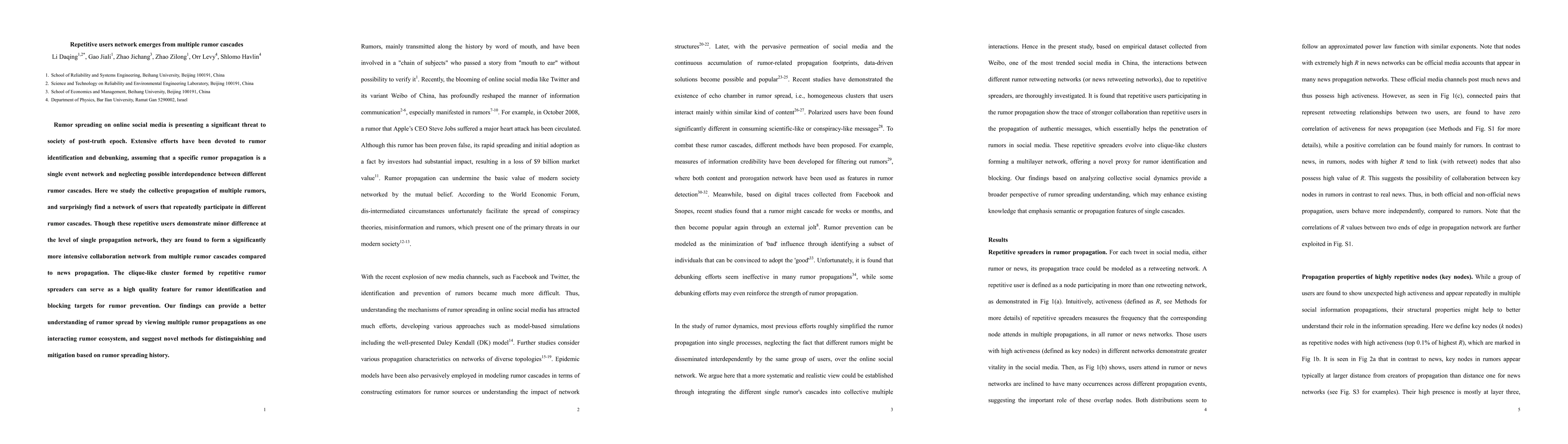 This study reveals that a network of repetitive users consistently participates in multiple rumor cascades on social media, forming a collaborative cluster distinct from typical news propagation. These clique-like clusters serve as crucial features for identifying and mitigating rumors, offering a new perspective on rumor spread as an interconnected ecosystem.