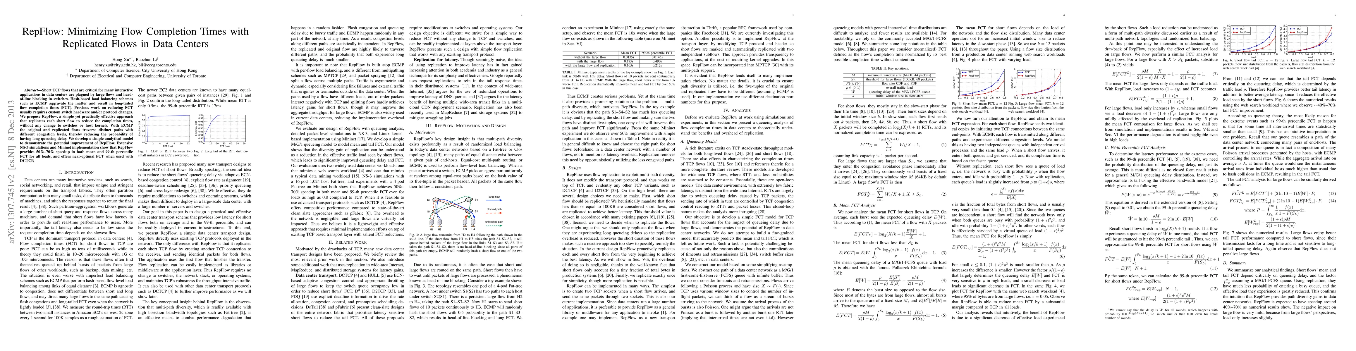 Short TCP flows that are critical for many interactive applications in data centers are plagued by large flows and head-of-line blocking in switches. Hash-based load balancing schemes such as ECMP aggravate the matter and result in long-tailed flow completion times (FCT). Previous work on reducing FCT usually requires custom switch hardware and/or protocol changes. We propose RepFlow, a simple yet practically effective approach that replicates each short flow to reduce the completion times, without any change to switches or host kernels. With ECMP the original and replicated flows traverse distinct paths with different congestion levels, thereby reducing the probability of having long queueing delay. We develop a simple analytical model to demonstrate the potential improvement of RepFlow. Extensive NS-3 simulations and Mininet implementation show that RepFlow provides 50%--70% speedup in both mean and 99-th percentile FCT for all loads, and offers near-optimal FCT when used with DCTCP.