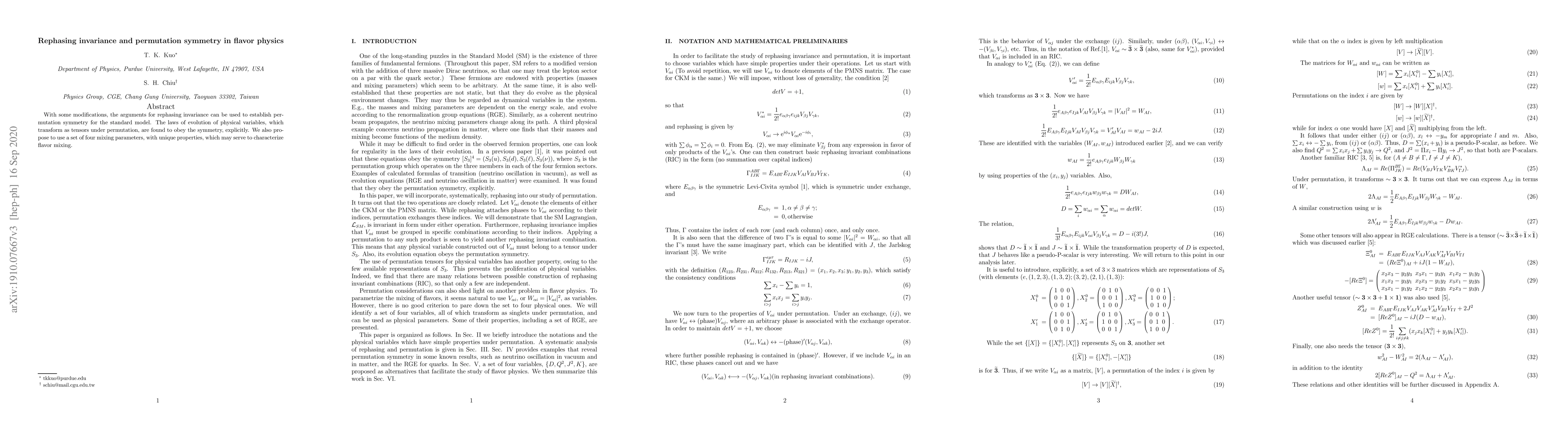 This paper demonstrates how arguments for rephasing invariance can establish permutation symmetry in the standard model, showing that tensor-like evolution laws of physical variables respect this symmetry. It proposes a novel set of four mixing parameters to characterize flavor mixing.