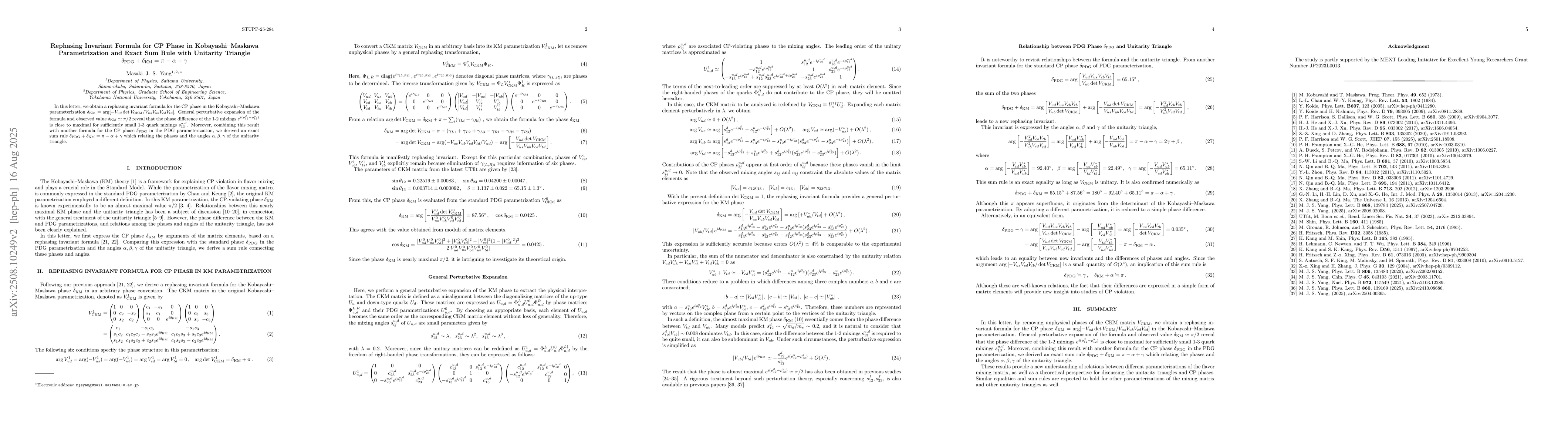 In this letter, we obtain a rephasing invariant formula for the CP phase in the Kobayashi--Maskawa parameterization $\delta_{\rm KM} = \arg [ - { V_{ud} \det V_{\rm CKM} / V_{us} V_{ub} V_{cd} V_{td}} ]$. General perturbative expansion of the formula and observed value $\delta_{\rm KM} \simeq \pi/2$ reveal that the phase difference of the 1-2 mixings $e^{i (\rho_{12}^{d} - \rho_{12}^{u})}$ is close to maximal for sufficiently small 1-3 quark mixings $s_{13}^{u,d}$. Moreover, combining this result with another formula for the CP phase $\delta_{\rm PDG}$ in the PDG parameterization, we derived an exact sum rule $\delta_{\rm PDG} + \delta_{\rm KM} = \pi - \alpha + \gamma$ which relating the phases and the angles $\alpha, \beta, \gamma$ of the unitarity triangle.