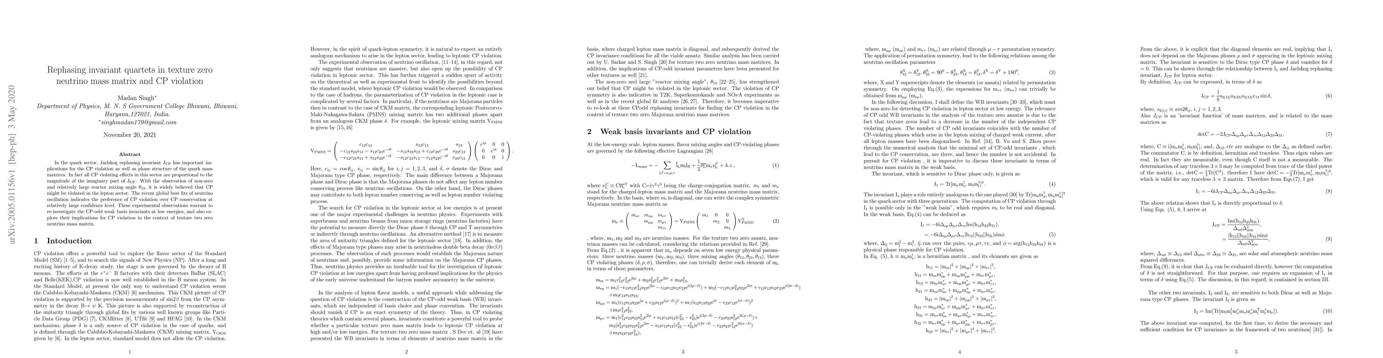 In the quark sector, Jarlskog rephasing invariant $\rm{J_{CP}}$ has important implications for the CP violation as well as phase structure of the quark mass matrices. In fact all CP violating effects in this sector are proportional to the magnitude of the imaginary part of $\rm{J_{CP}}$. With the observation of non-zero and relatively large reactor mixing angle $\theta_{13}$, it is widely believed that CP might be violated in the lepton sector. The recent global best fits of neutrino oscillation indicates the preference of CP violation over CP conservation at relatively large confidence level. These experimental observations warrant to re-investigate the CP-odd weak basis invariants at low energies, and also explore their implications for CP violation in the context of texture two zero neutrino mass matrix.