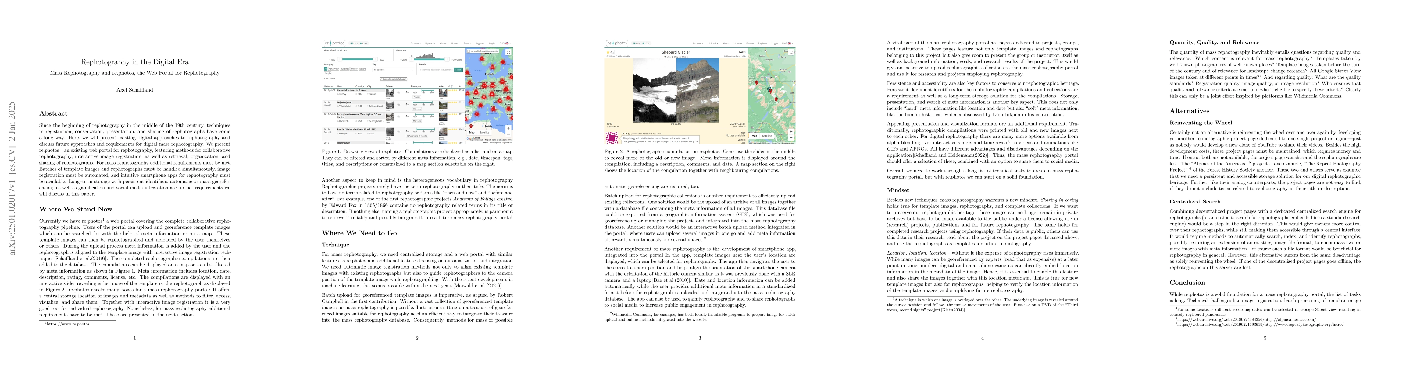 This paper explores advancements in digital rephotography techniques, focusing on the web portal re.photos which facilitates collaborative and interactive rephotography. It outlines future needs for mass rephotography, including automated image registration, smartphone app integration, and long-term storage solutions.