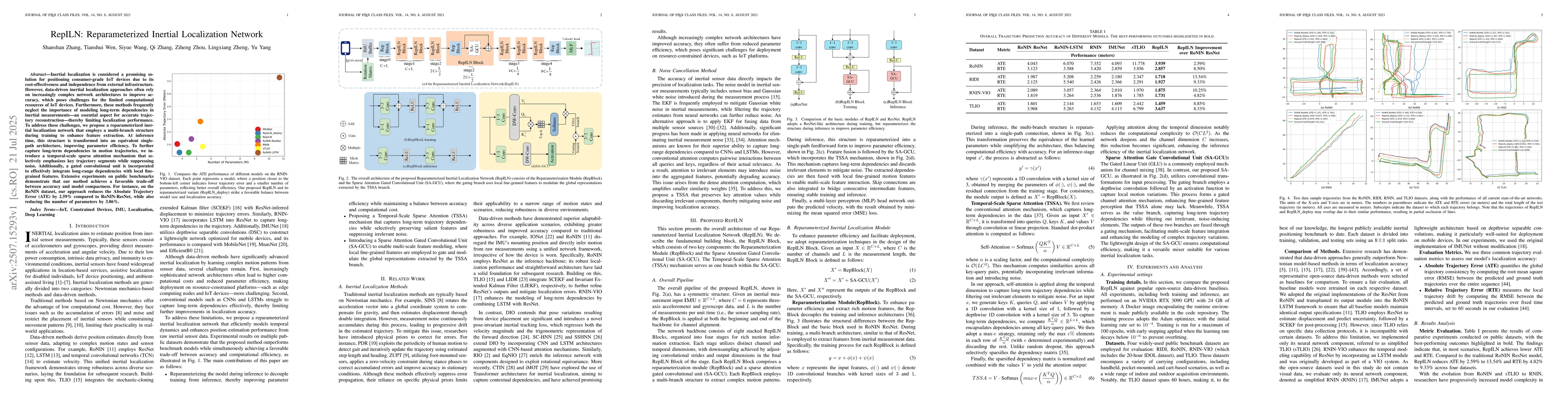 Inertial localization is regarded as a promising positioning solution for consumer-grade IoT devices due to its cost-effectiveness and independence from external infrastructure. However, data-driven inertial localization methods often rely on increasingly complex network architectures to improve accuracy, which challenges the limited computational resources of IoT devices. Moreover, these methods frequently overlook the importance of modeling long-term dependencies in inertial measurements - a critical factor for accurate trajectory reconstruction - thereby limiting localization performance. To address these challenges, we propose a reparameterized inertial localization network that uses a multi-branch structure during training to enhance feature extraction. At inference time, this structure is transformed into an equivalent single-path architecture to improve parameter efficiency. To further capture long-term dependencies in motion trajectories, we introduce a temporal-scale sparse attention mechanism that selectively emphasizes key trajectory segments while suppressing noise. Additionally, a gated convolutional unit is incorporated to effectively integrate long-range dependencies with local fine-grained features. Extensive experiments on public benchmarks demonstrate that our method achieves a favorable trade-off between accuracy and model compactness. For example, on the RoNIN dataset, our approach reduces the Absolute Trajectory Error (ATE) by 2.59% compared to RoNIN-ResNet while reducing the number of parameters by 3.86%.