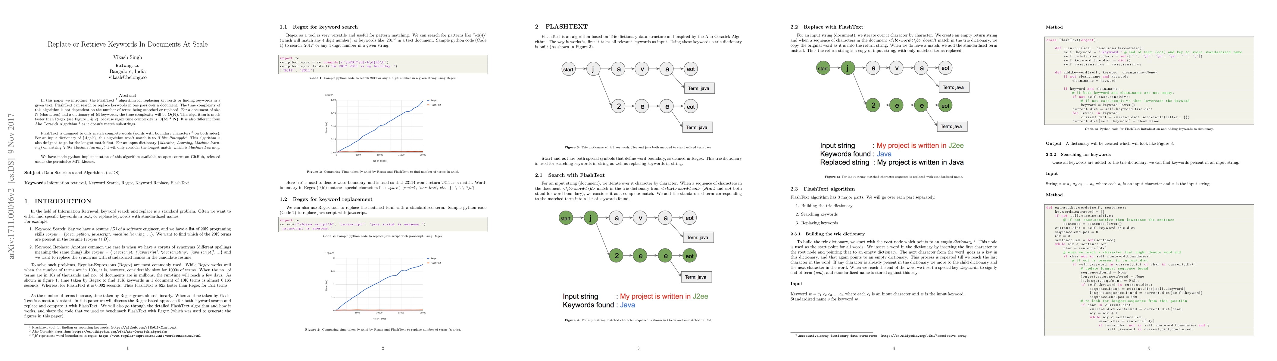 In this paper we introduce, the FlashText algorithm for replacing keywords or finding keywords in a given text. FlashText can search or replace keywords in one pass over a document. The time complexity of this algorithm is not dependent on the number of terms being searched or replaced. For a document of size N (characters) and a dictionary of M keywords, the time complexity will be O(N). This algorithm is much faster than Regex, because regex time complexity is O(MxN). It is also different from Aho Corasick Algorithm, as it doesn't match substrings. FlashText is designed to only match complete words (words with boundary characters on both sides). For an input dictionary of {Apple}, this algorithm won't match it to 'I like Pineapple'. This algorithm is also designed to go for the longest match first. For an input dictionary {Machine, Learning, Machine learning} on a string 'I like Machine learning', it will only consider the longest match, which is Machine Learning. We have made python implementation of this algorithm available as open-source on GitHub, released under the permissive MIT License.