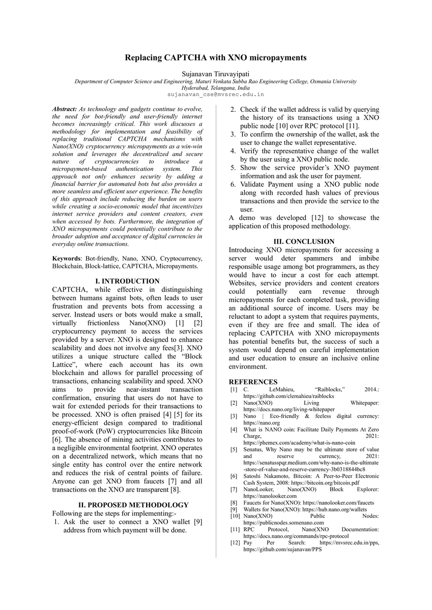 This paper proposes replacing CAPTCHA with XNO cryptocurrency micropayments to enhance security and user experience. The system uses the decentralized nature of cryptocurrencies to create a socio-economic model that incentivizes service providers and content creators, thereby potentially boosting digital currency adoption.