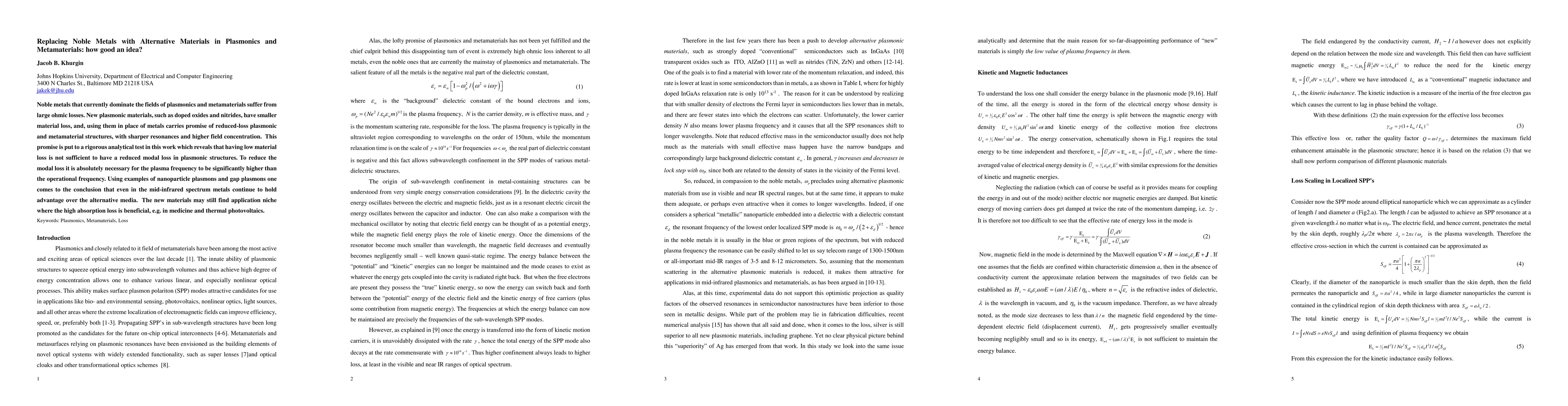 New materials for plasmonics and metamaterials show promise in reducing losses, but don't outperform noble metals until their plasma frequency is higher than the operational frequency, even in mid-infrared spectrum.