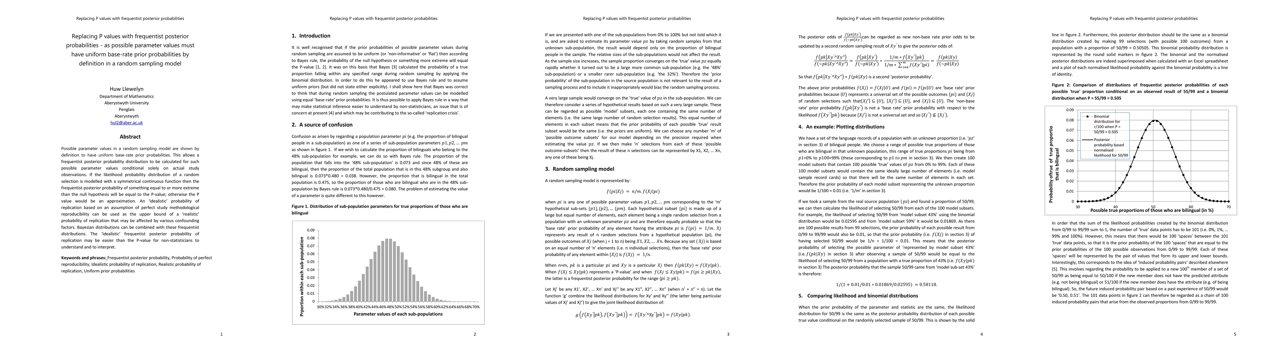 This paper argues that in a random sampling model, all possible parameter values should have uniform prior probabilities, allowing for the calculation of a frequentist posterior probability distribution. It suggests that this distribution may serve as a more intuitive alternative to P-values, especially when methodological reproducibility is considered.