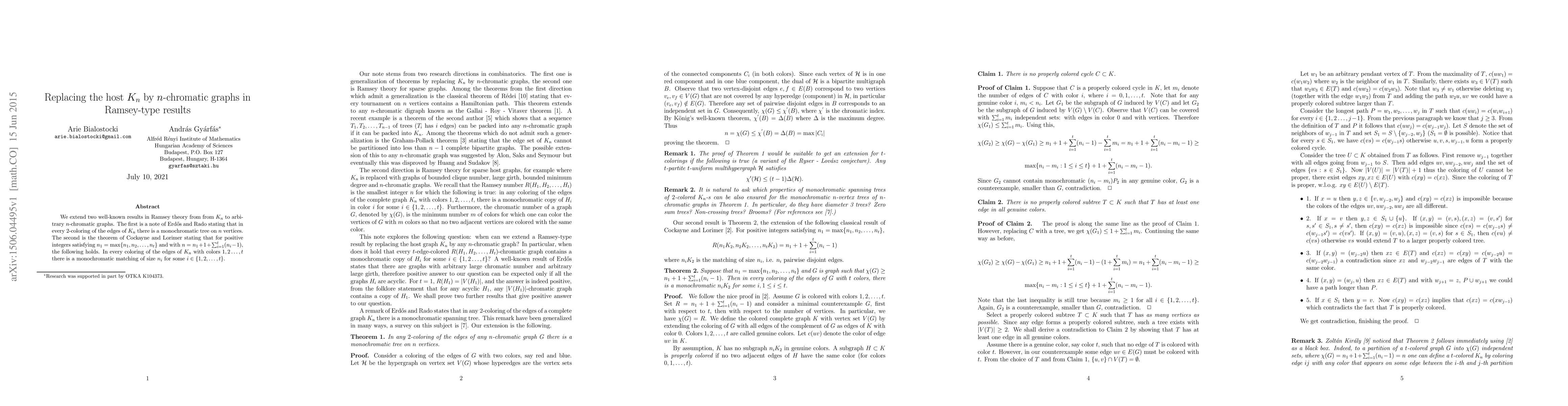 This paper extends Ramsey theory results from complete graphs $K_n$ to arbitrary $n$-chromatic graphs. It builds upon Erdős and Rado's note about monochromatic trees and Cockayne and Lorimer's theorem concerning monochromatic matchings in edge-colored $K_n$. The extension provides new insights into the existence of monochromatic subgraphs in colored graphs beyond complete graphs.
