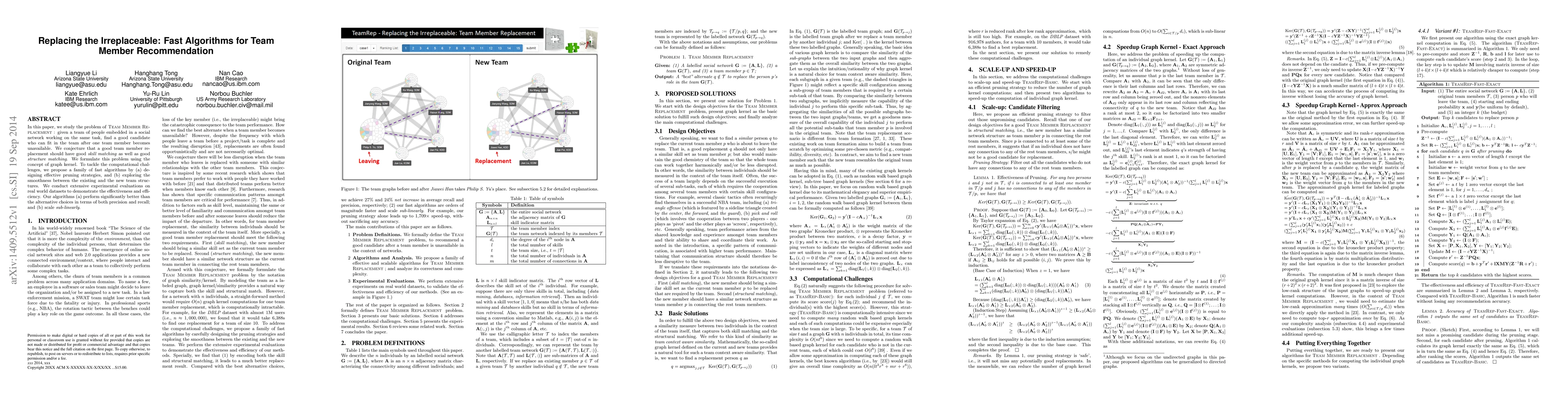 This paper proposes fast algorithms for recommending suitable replacements for unavailable team members based on skill and structure matching within a social network. The authors introduce effective pruning strategies and leverage structural smoothness to tackle computational challenges, demonstrating superior performance and sub-linear scalability through extensive evaluations on real datasets.