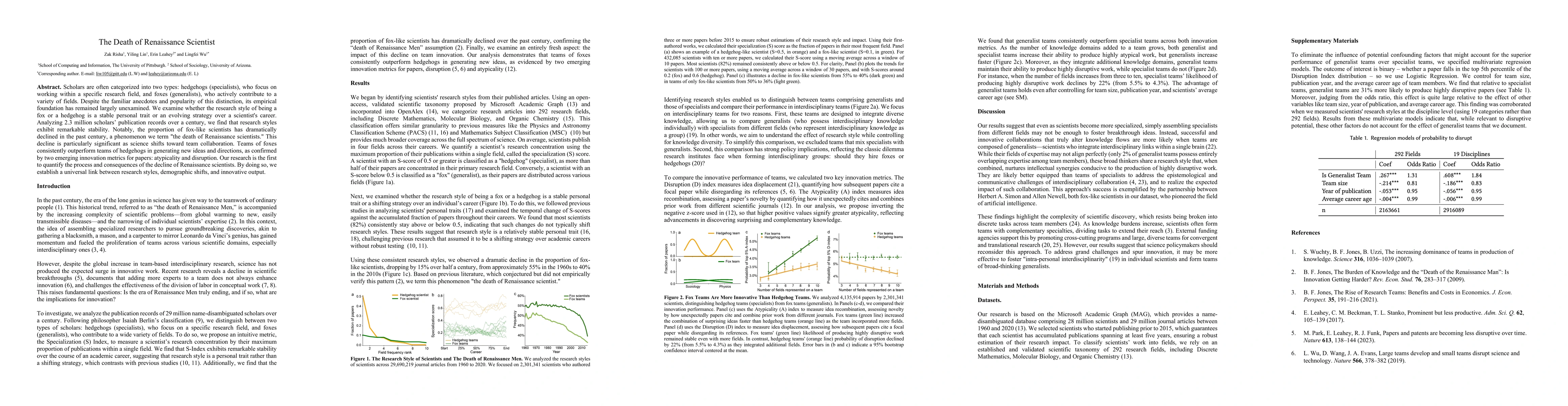 This study examines the effectiveness of interdisciplinary collaboration (IDC) in scientific teams, finding that generalists outperform specialists in maintaining innovation capability as team size grows. Contrary to the belief that more experts lead to more breakthroughs, the research suggests that cross-disciplinary collaboration among generalists fosters more disruptive scientific work.