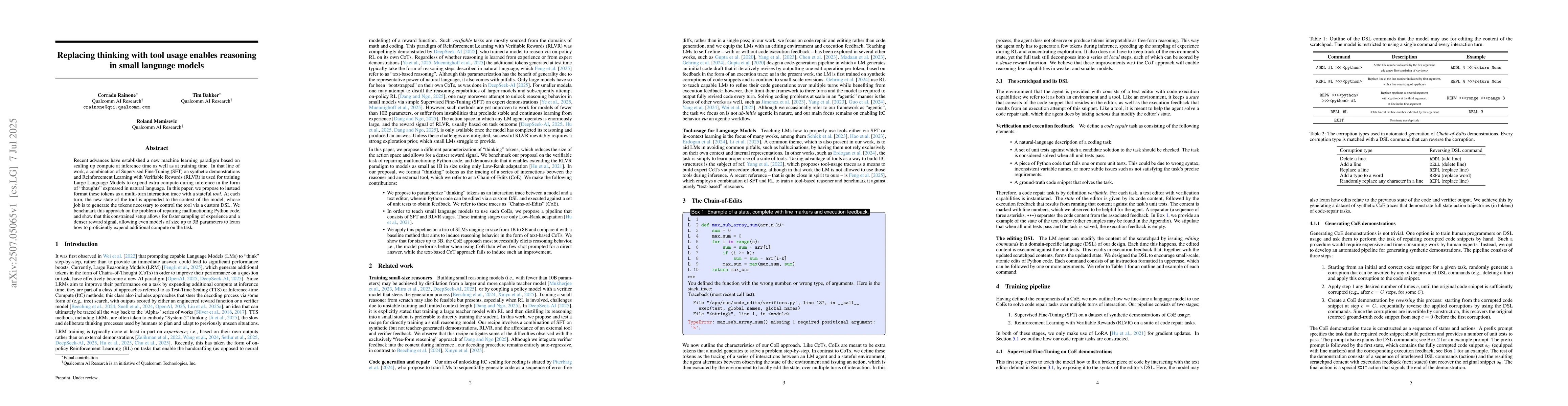 The paper proposes a novel approach to enable reasoning in small language models by formatting 'thinking' tokens as a multi-turn interaction trace with a stateful tool. This method is benchmarked on repairing malfunctioning Python code, showing that even models of up to 3B parameters can learn to proficiently expend additional compute on the task.