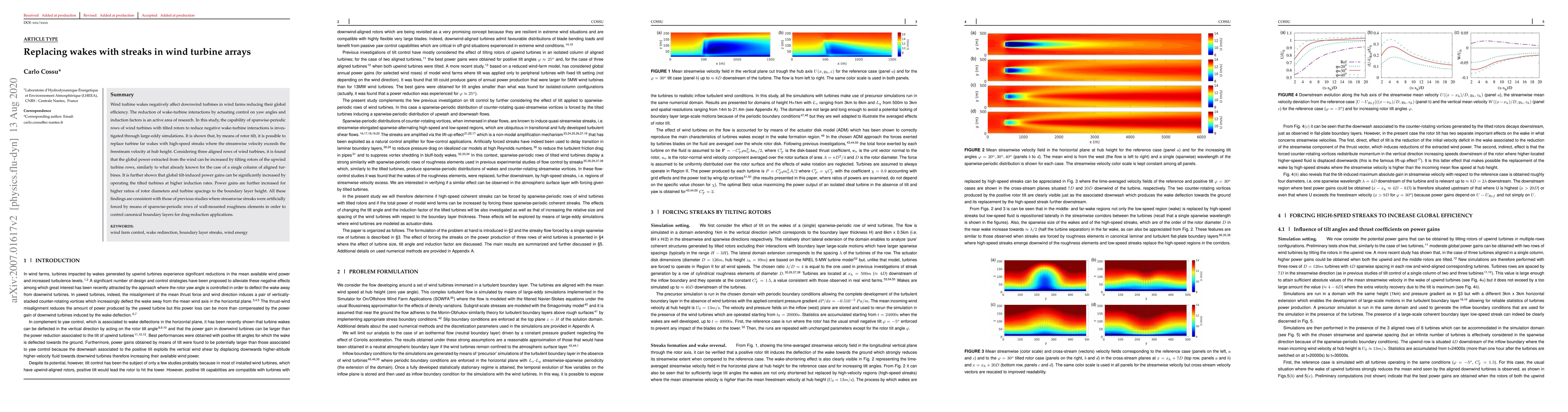 This study investigates how spanwise-periodic wind turbine arrays with tilted rotors can replace turbine wakes with high-speed streaks, thereby increasing global power extraction. The research shows that rotor tilt and higher induction rates can significantly enhance power gains, similar to findings from previous studies using roughness elements for drag reduction.