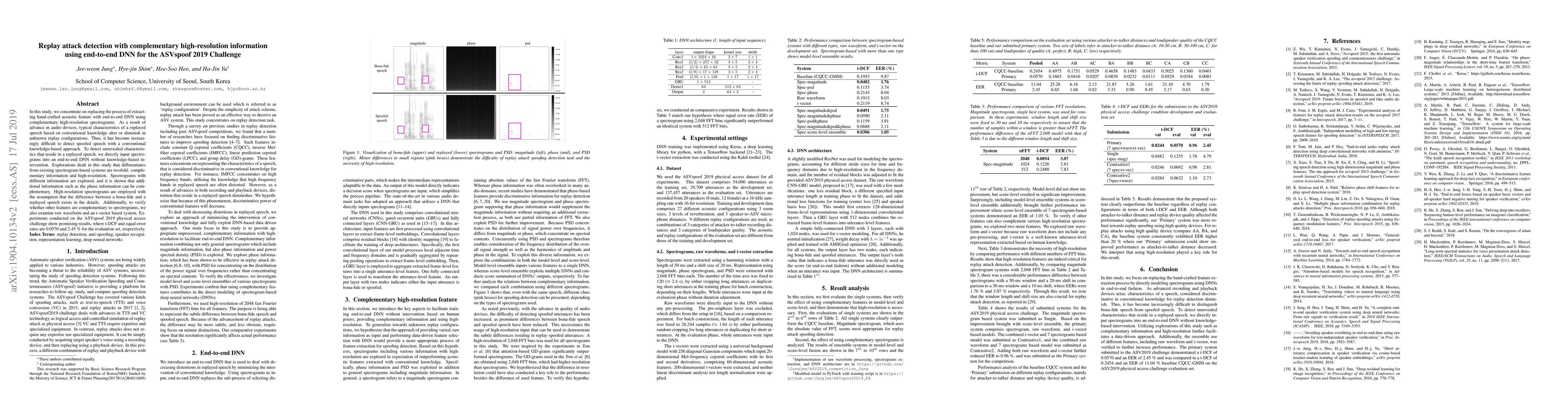 In this study, we concentrate on replacing the process of extracting hand-crafted acoustic feature with end-to-end DNN using complementary high-resolution spectrograms. As a result of advance in audio devices, typical characteristics of a replayed speech based on conventional knowledge alter or diminish in unknown replay configurations. Thus, it has become increasingly difficult to detect spoofed speech with a conventional knowledge-based approach. To detect unrevealed characteristics that reside in a replayed speech, we directly input spectrograms into an end-to-end DNN without knowledge-based intervention. Explorations dealt in this study that differentiates from existing spectrogram-based systems are twofold: complementary information and high-resolution. Spectrograms with different information are explored, and it is shown that additional information such as the phase information can be complementary. High-resolution spectrograms are employed with the assumption that the difference between a bona-fide and a replayed speech exists in the details. Additionally, to verify whether other features are complementary to spectrograms, we also examine raw waveform and an i-vector based system. Experiments conducted on the ASVspoof 2019 physical access challenge show promising results, where t-DCF and equal error rates are 0.0570 and 2.45 % for the evaluation set, respectively.