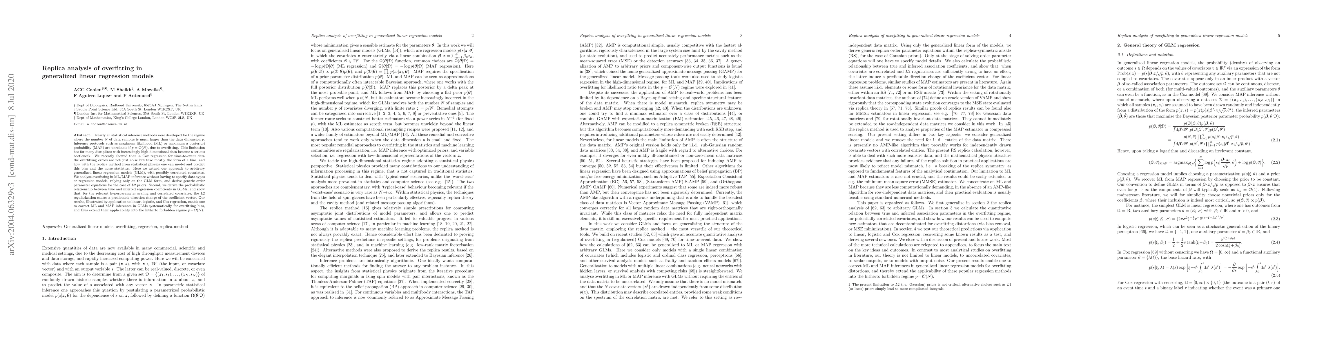 The research extends replica analysis to generalized linear models (GLMs) for overfitting in maximum a posteriori (MAP) and maximum likelihood (ML) inference, initially developed for Cox regression with time-to-event data. It predicts both the bias and excess noise distribution in the high-dimensional regime where p is comparable to N, enabling corrections for overfitting in GLMs.